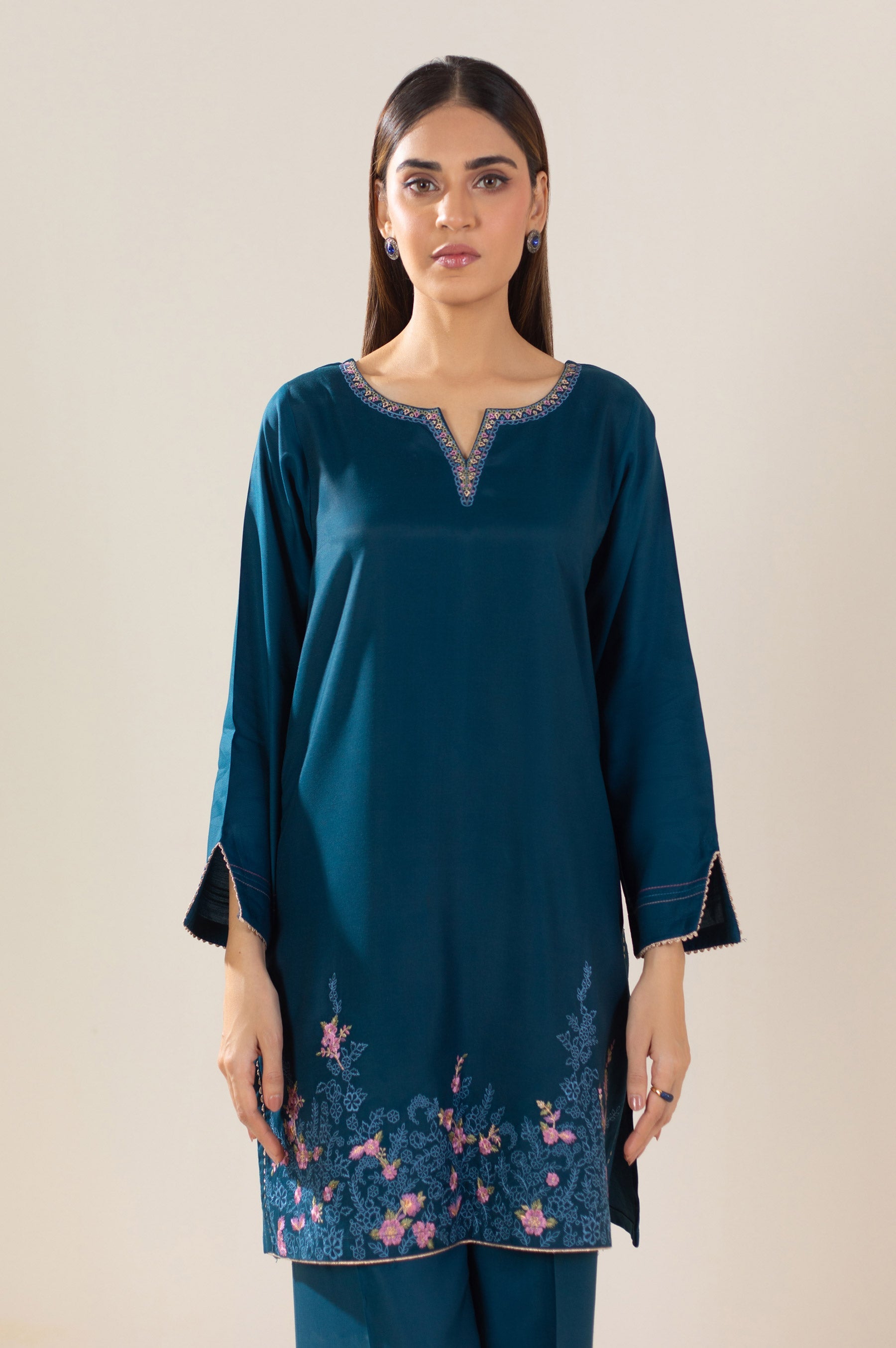 Look radiant this season in this fascinating short shirt illustrated in an enchanting teal green shade. The shirt has beautiful delicate embroidery spreading all over the hem. The shirt is paired with embroidered culotte, which is perfect for evening gatherings.