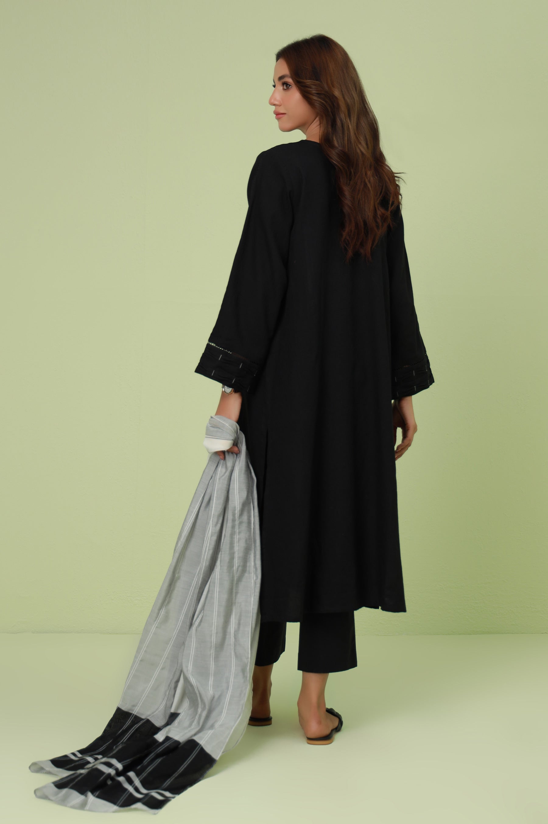 This black outfit is the perfect depiction of modern yet classic with a bold neckline outlined in dori. The front also features two pleats with diagonal sticthes along with fabric manipulation on the sleevesfor a touch of detailing which enhances the look of the outfit. Pair the shirt with the dupatta for a chic look for any occassion.