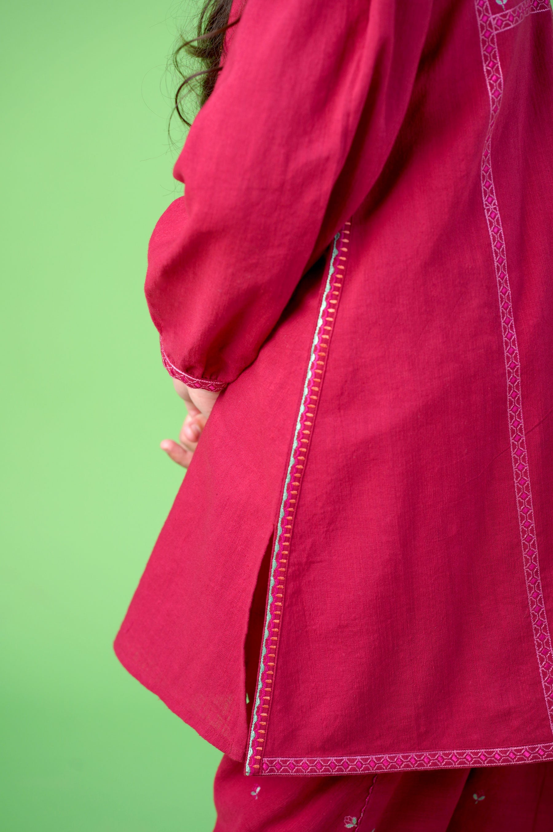 Let your little ones flaunt in this deep blush khaddar embroidered outfit that is composed of cute little tulips and flower buds in funky colours. Embroidered tulip shalwar is paired for a complete ethnic look.