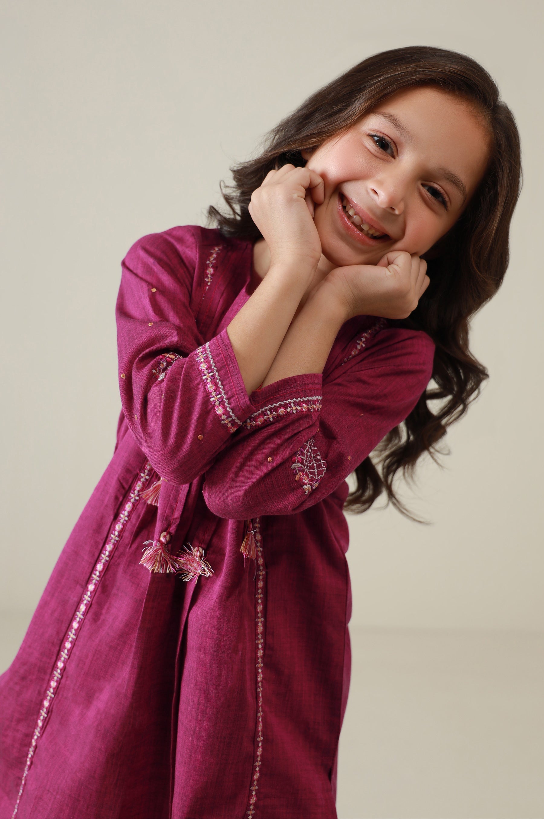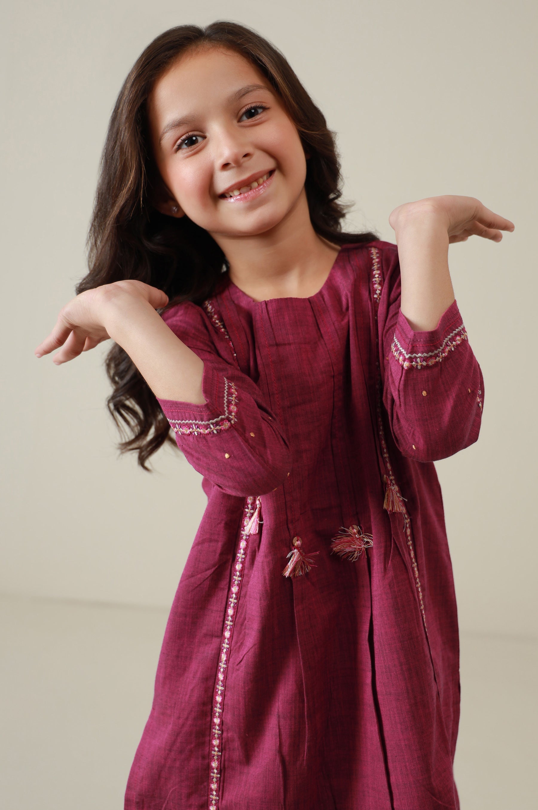 This yarn dyed outfit comprises of cute layout enhanced with pleats and tassel in center panel. Added with embroidery details on panel and sleeves developed with floral and geometrical elements. Paired with matching embroidered pants. Doll up your girls with this outfit to stand out at any gathering.