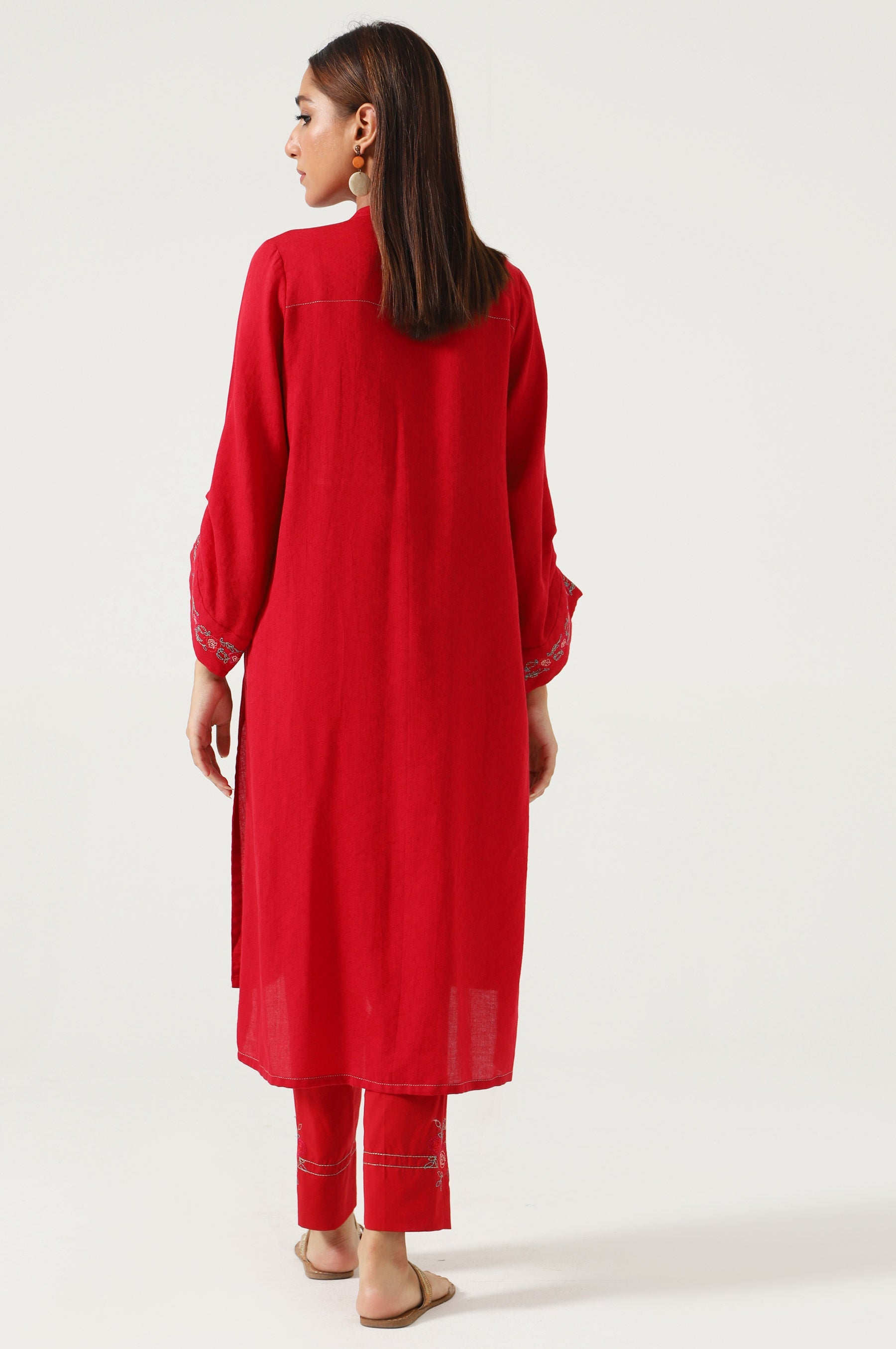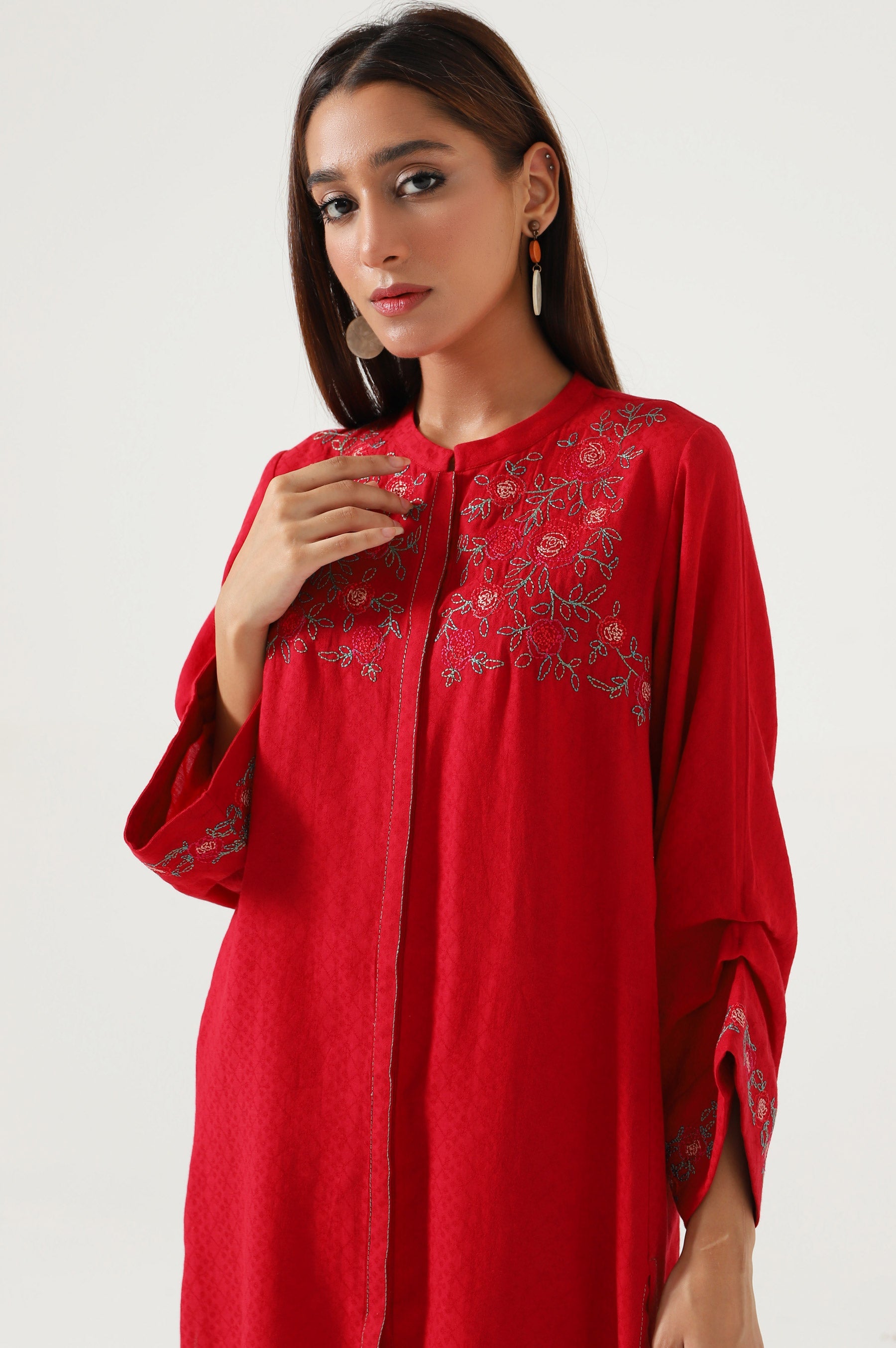 Take your style up a notch in our rubby red satin jacquard shirt enhance with running stitch looking embroidery highlighted with shade of pink and green which gives a sophisticated touch while the detailing on the sleeves add a statement looking factor. This beautiful shirt comes with a matching cambric pants with a same embroidery pattern.