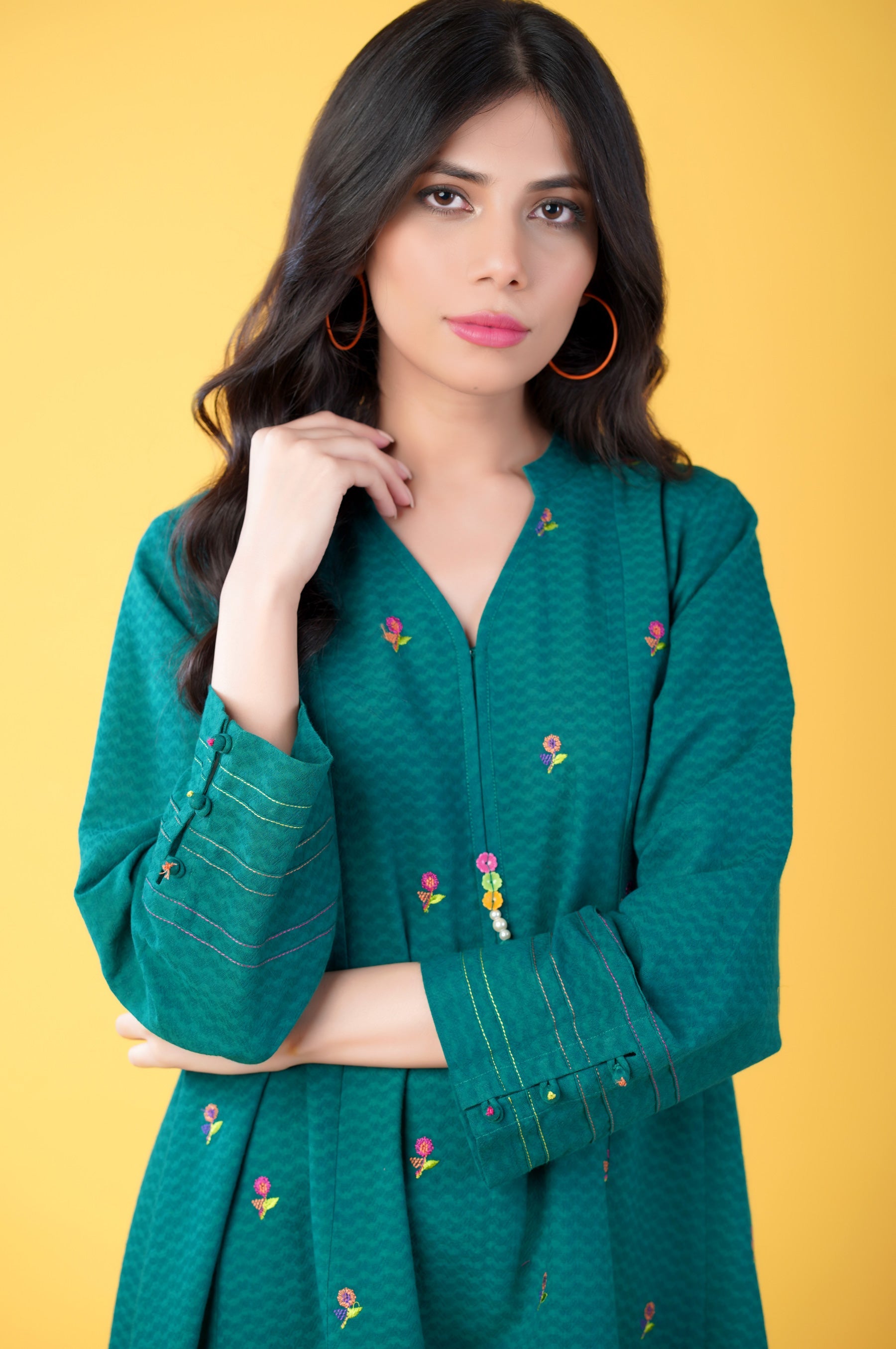 One color tone are the new trend. Be sure to be on trend at any event with this sea green co-ord composed with stunning cute and playful floral embroidery. This sure to be season favourite. This beautiful outfit comes with a matching pant with pintex detailing on the side seam.