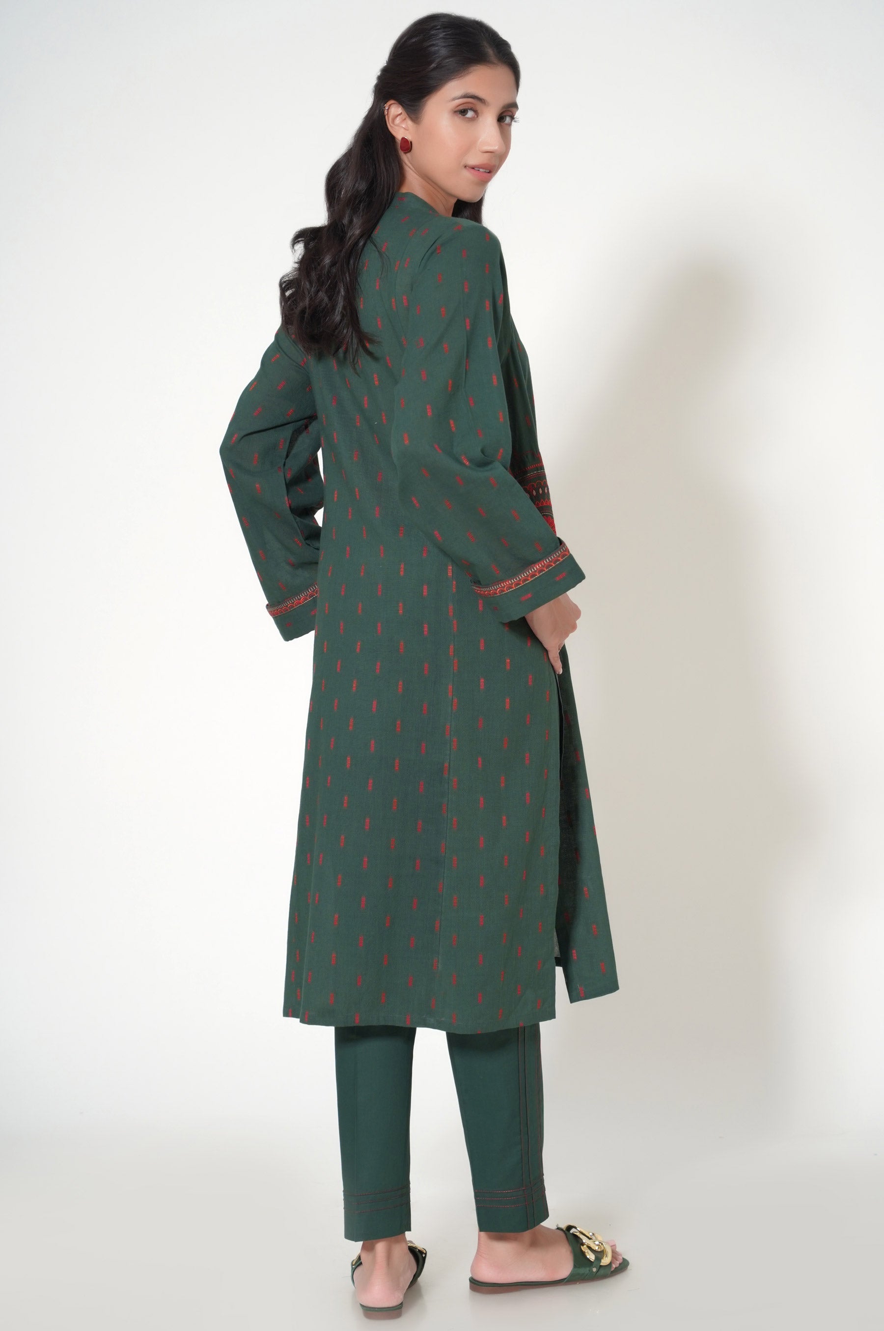 Elevate your wardrobe with this green jacquard shirt featuring embroidery on the neckline and the pockets to enhance the overall look. This shirt is paired with stylized pants highlighted with pintucks and stitchlines along the side and on the hem.