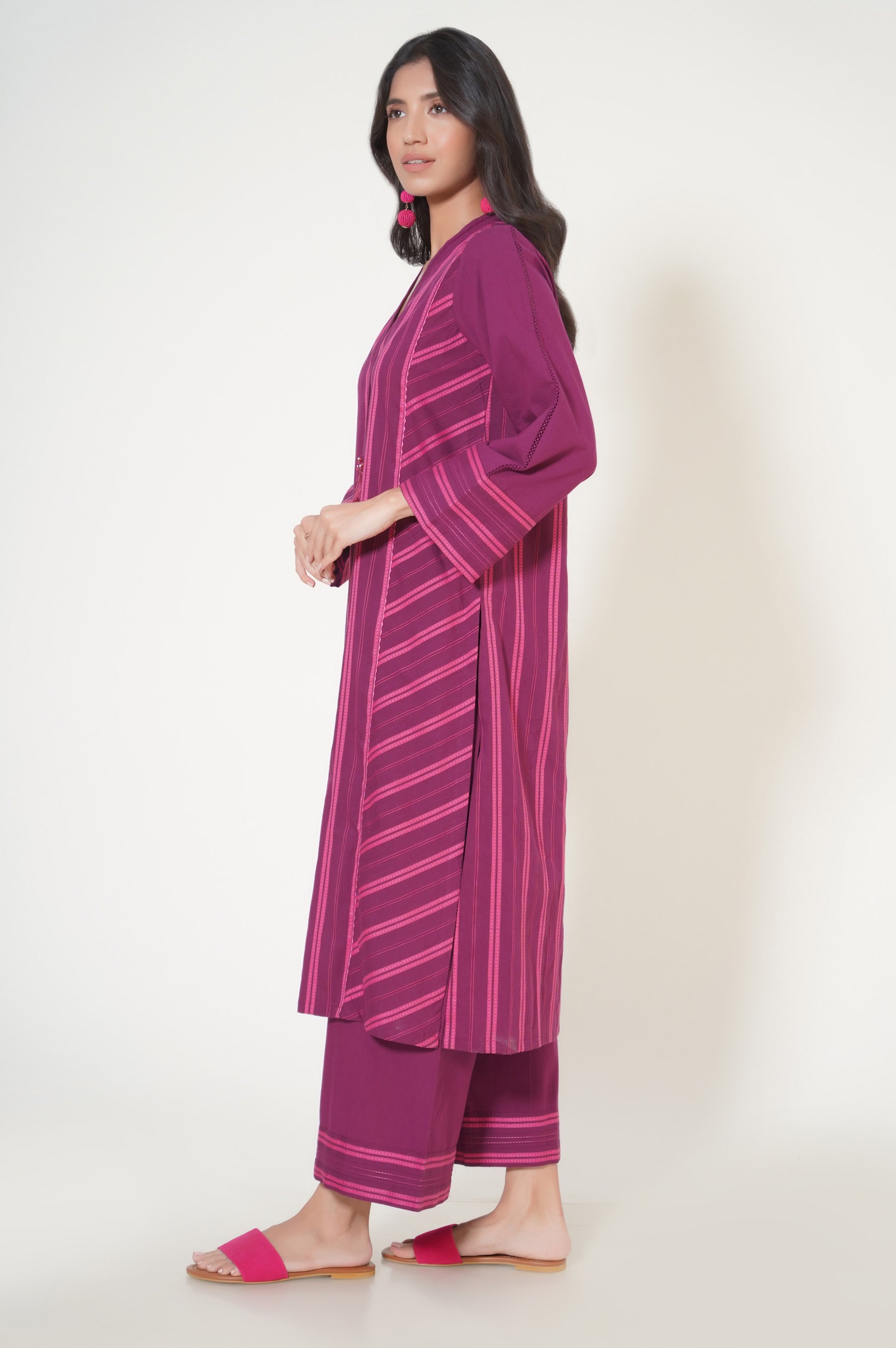 This magenta outfit is adorned with laces on the front panels as well as on the sleeves and neckline. The sleeves also feature pintucks on plain fabric and the neckline is also adorned with embellishments to enhance the overall look. Pair the shirt with matching culottes to brighten up your wardrobe this season.