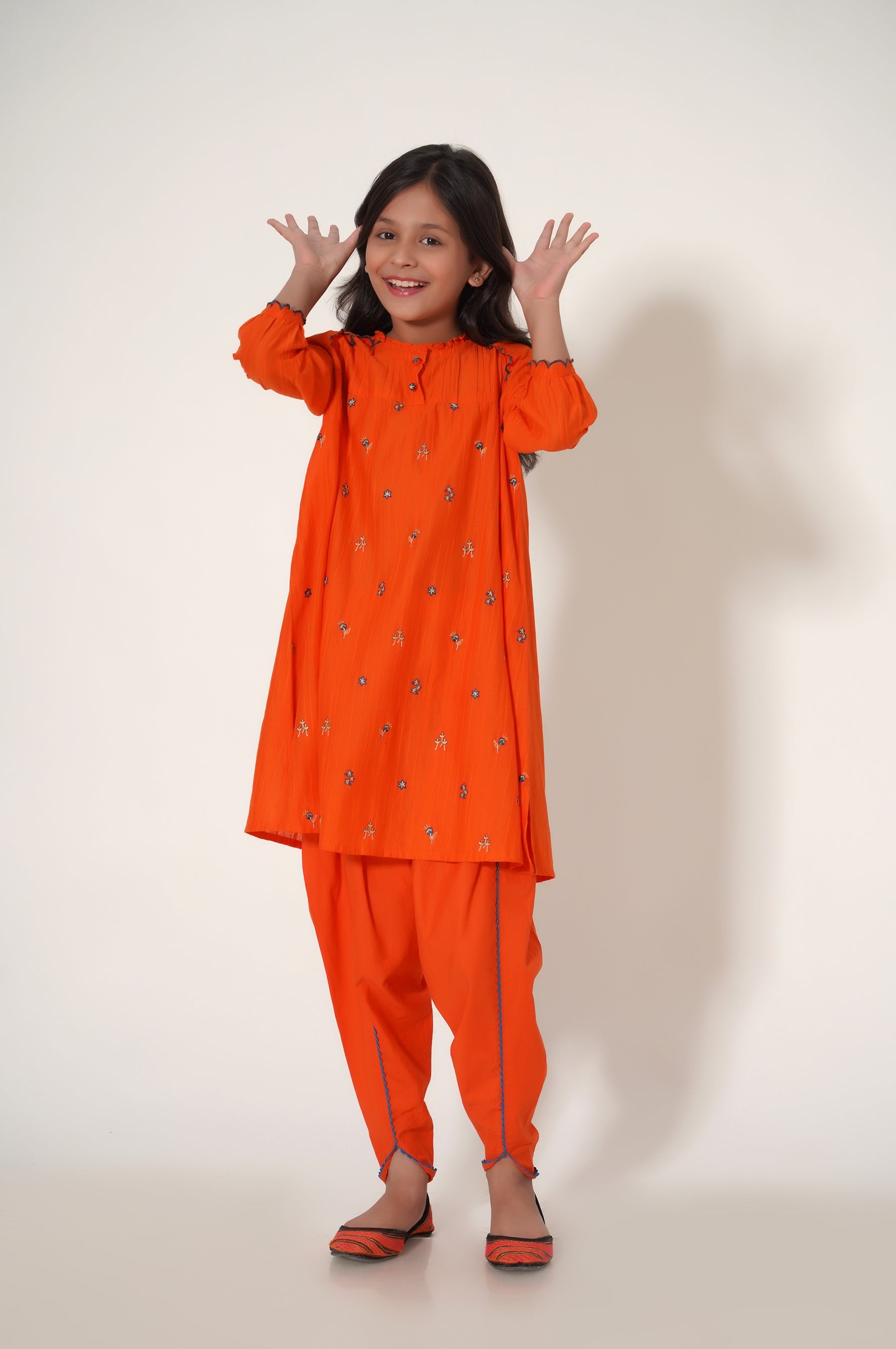 This super fun outfit is designed beautifully with all over embroidery on the front. The neckline includes ruffles and pin tux, followed by scallops on both sides. To complete the whole look, embroidered buttons are added on the placket. The shirt is paired with tulip shalwar with colored lace.