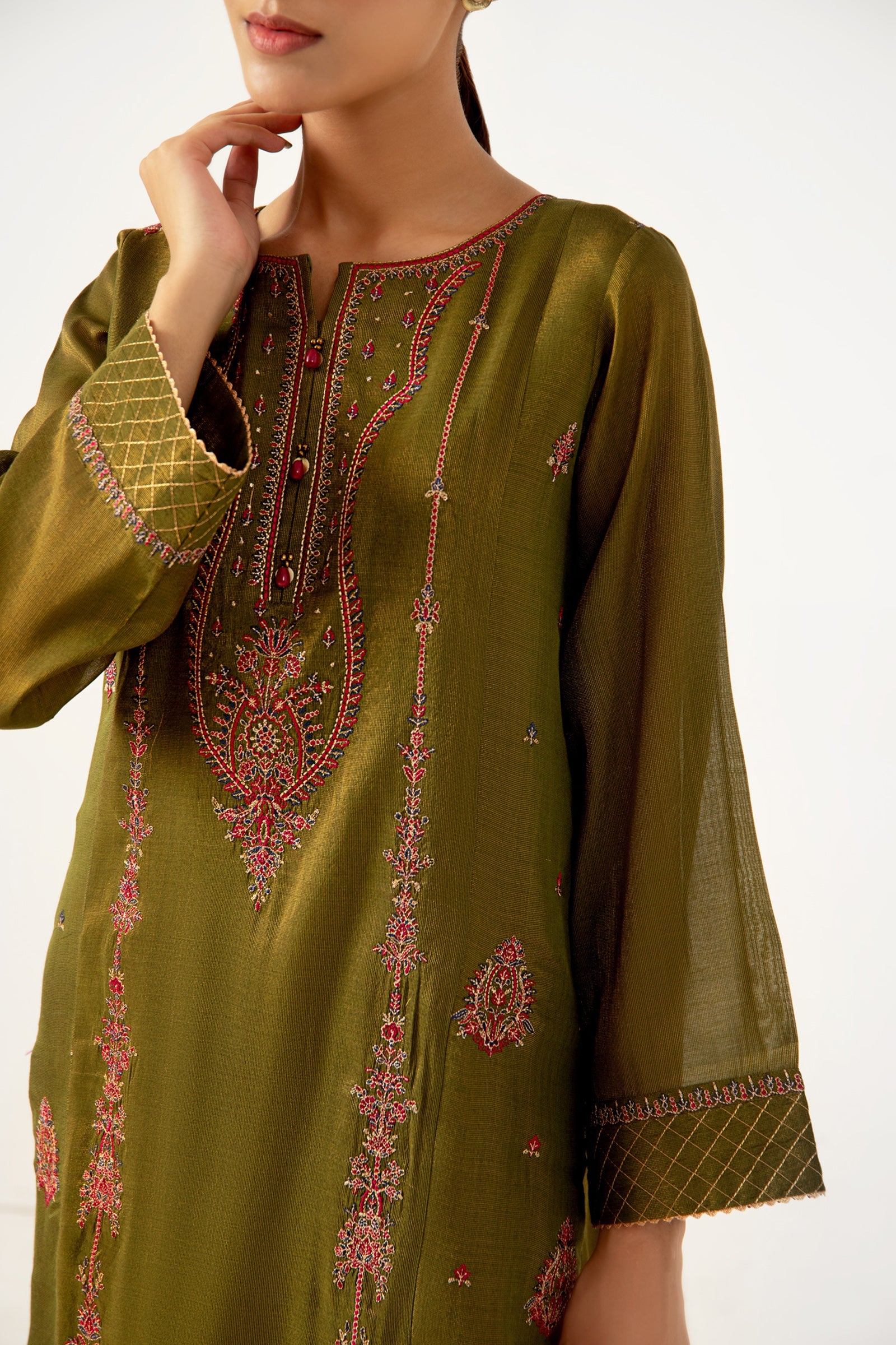 An understated and classic olive green mysuri shirt, rendered in floral embroidery with jewel toned colours.Paired with rawsilk embroidered bottom, is a timeless piece of this season.