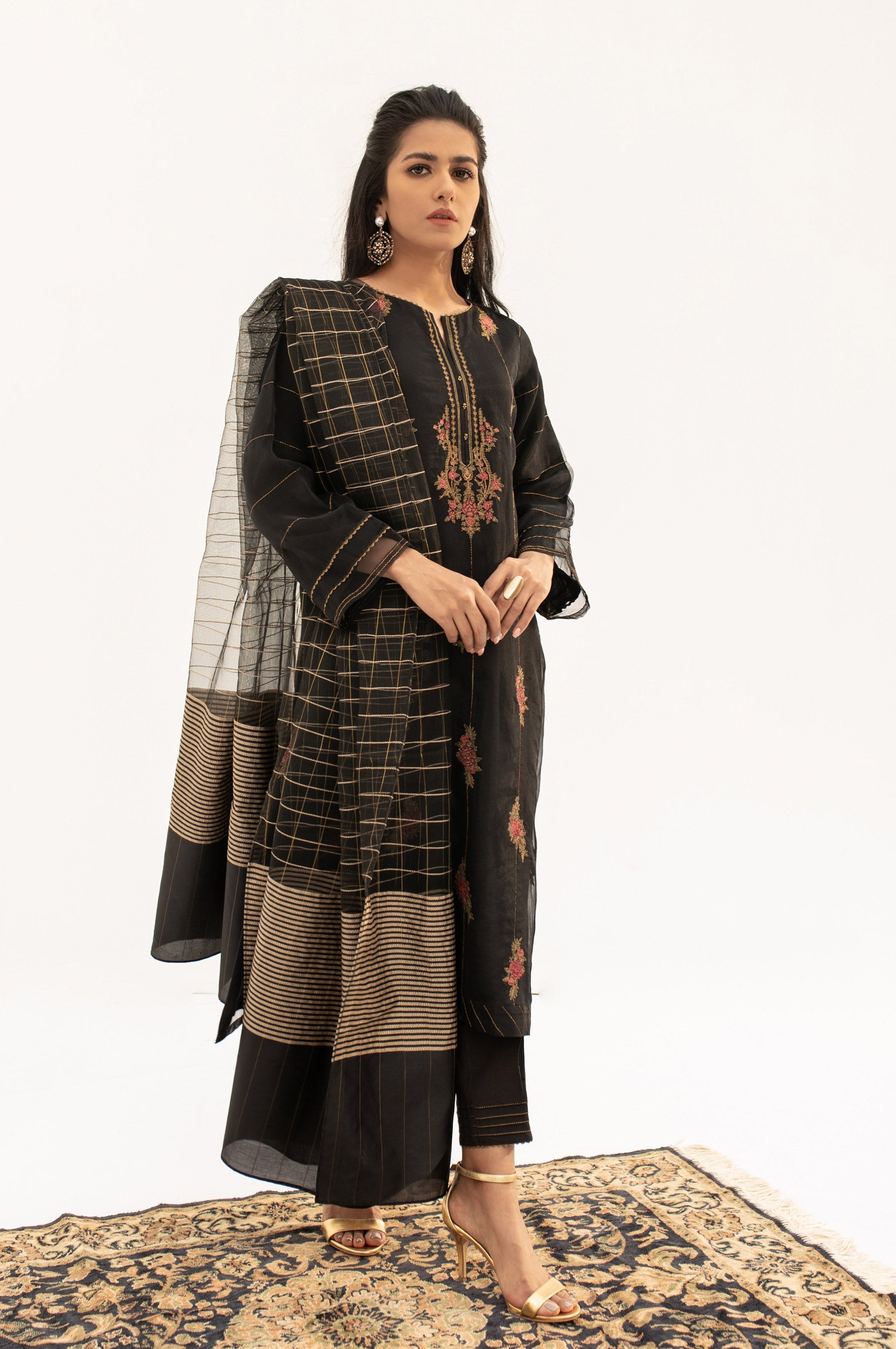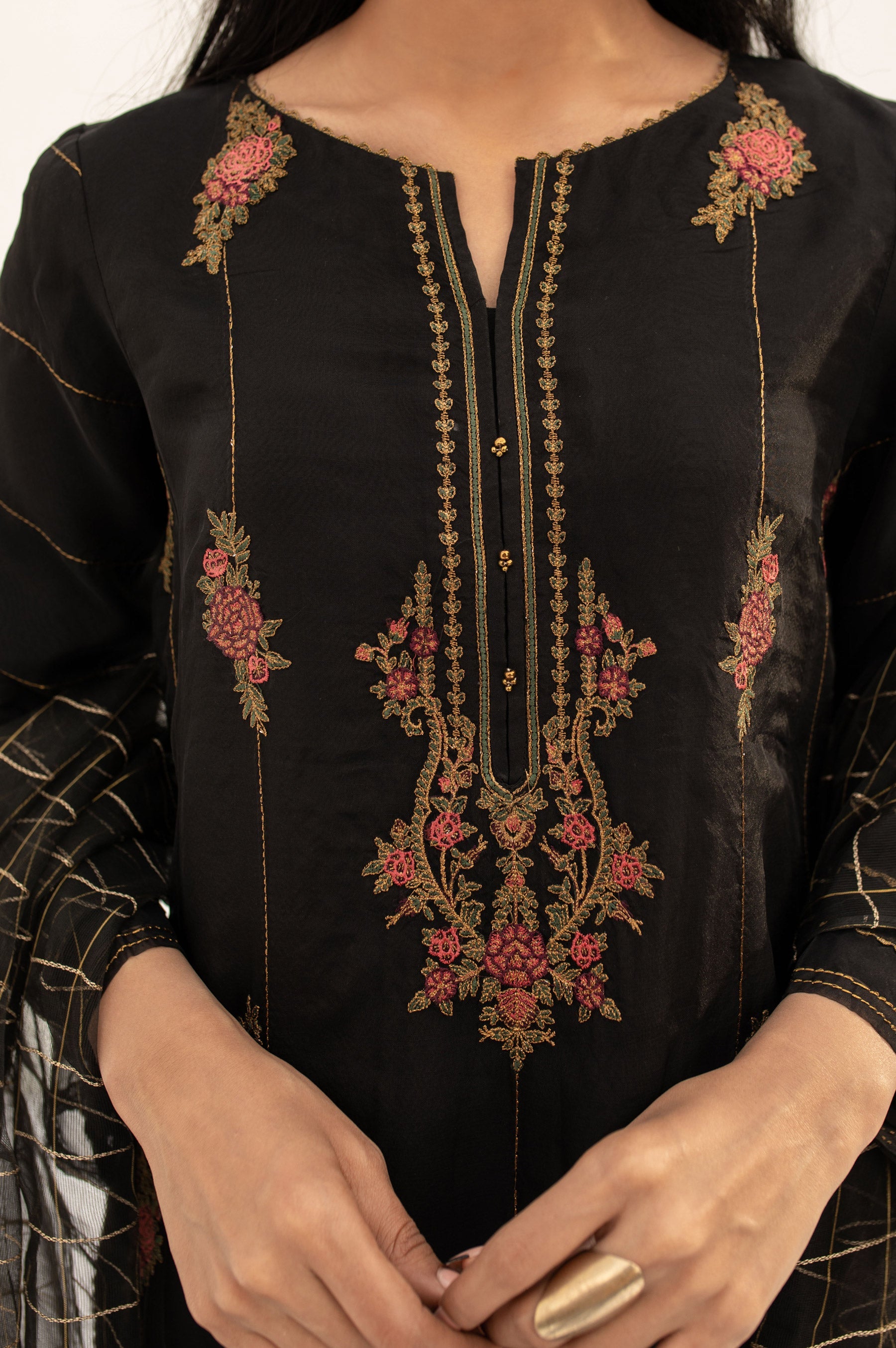 A sophisticated 2pc black organza front embroidered shirt, inspired by vintage rosettes. Paired with woven zari duppta,style this ensemble to in intimate gatherings in this season.