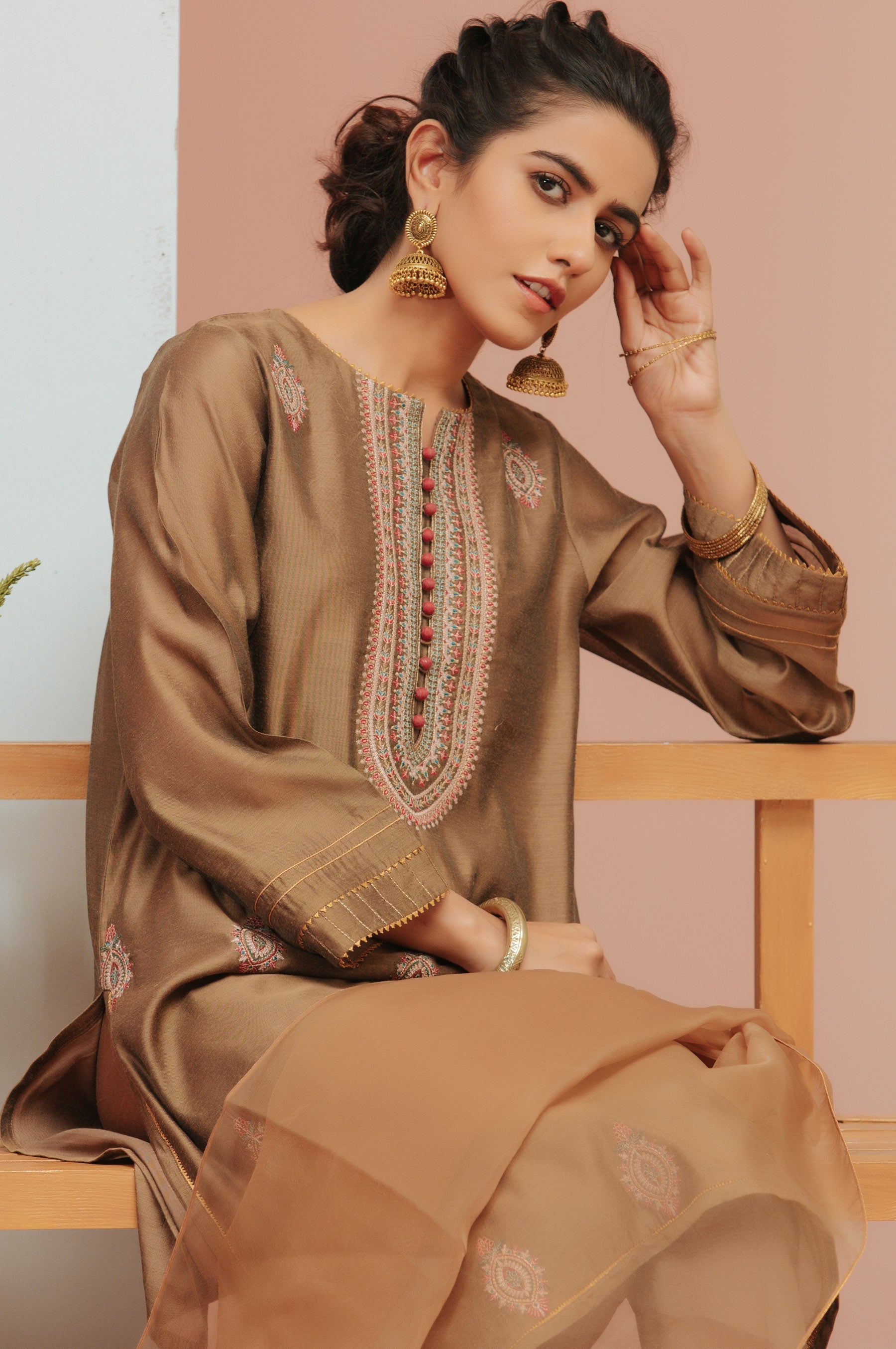Stitched 2 Piece Paper Silk Dyed Embroidered Suit