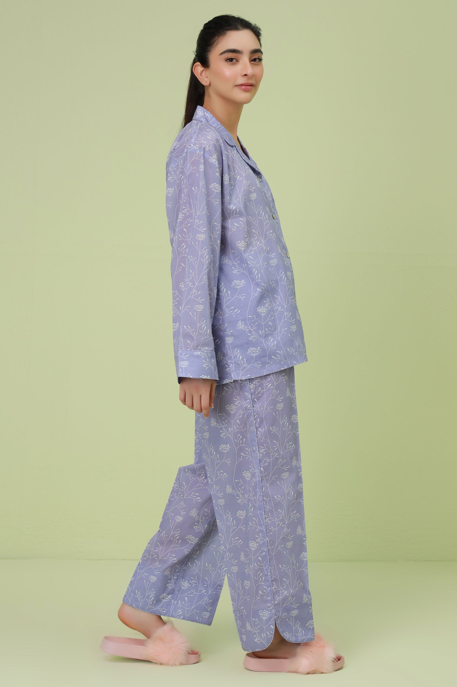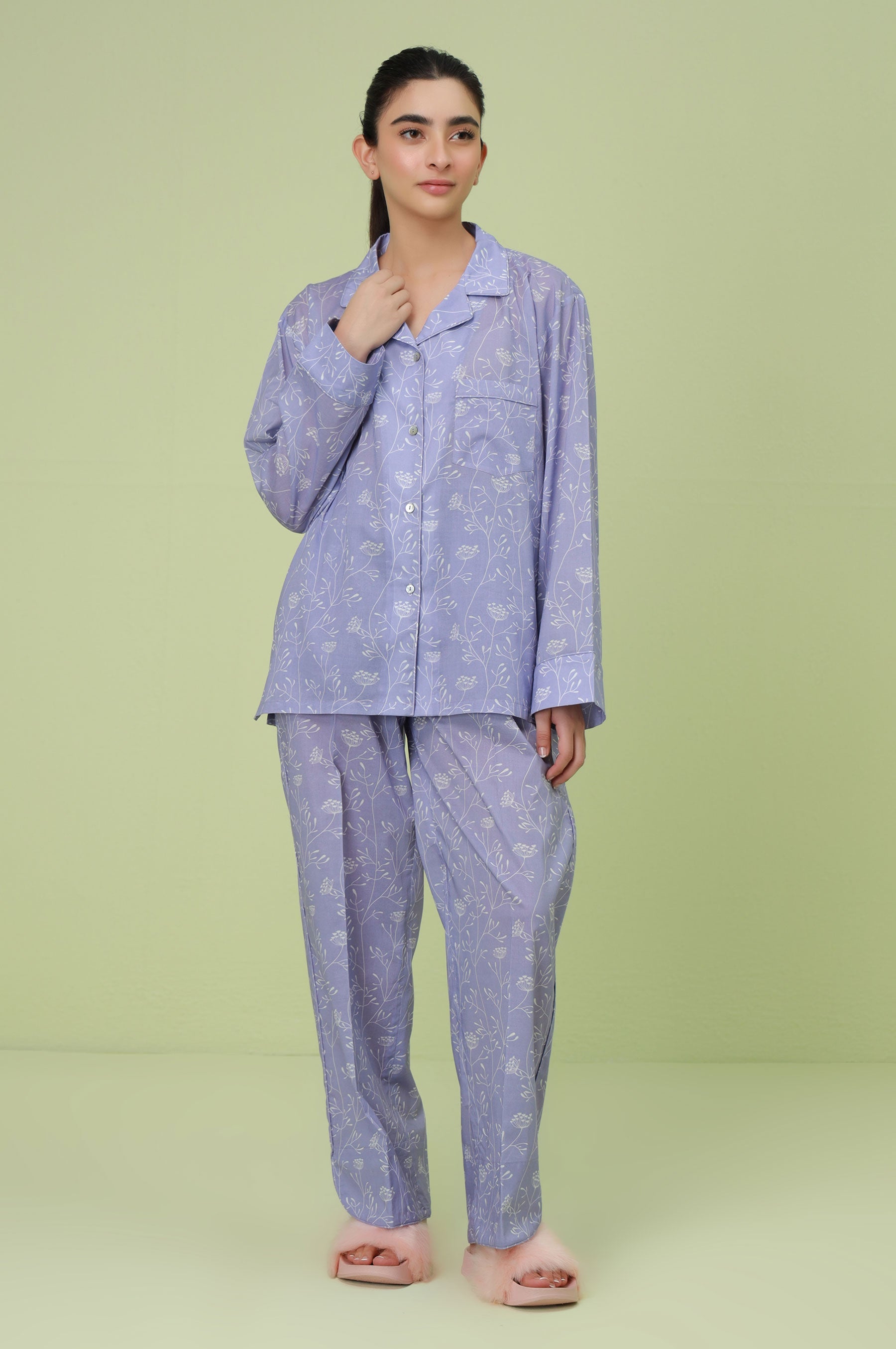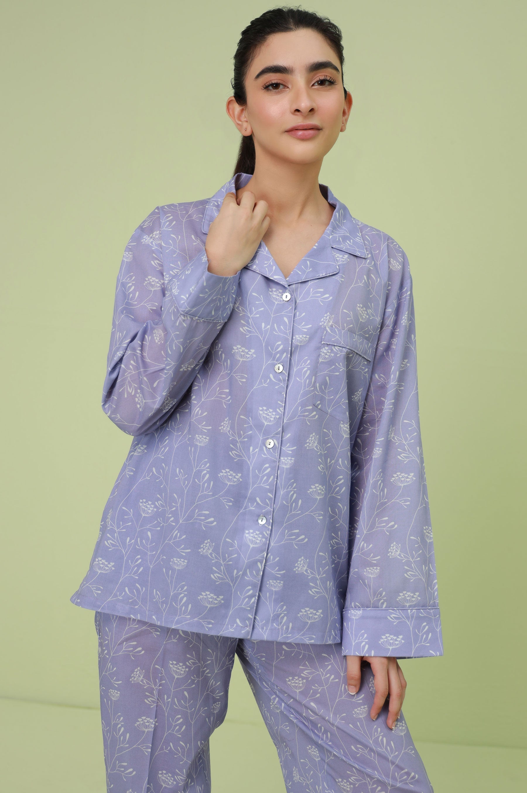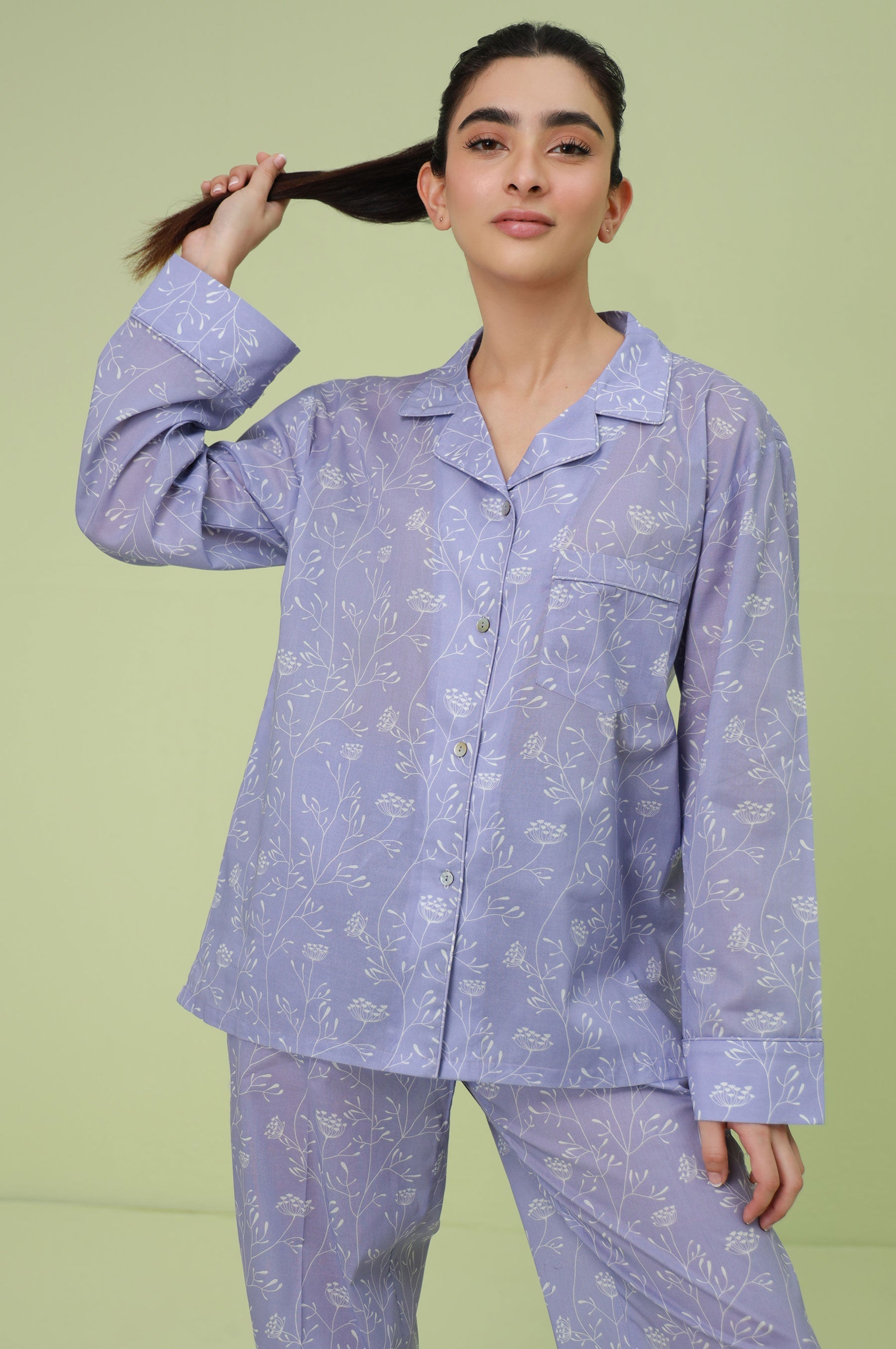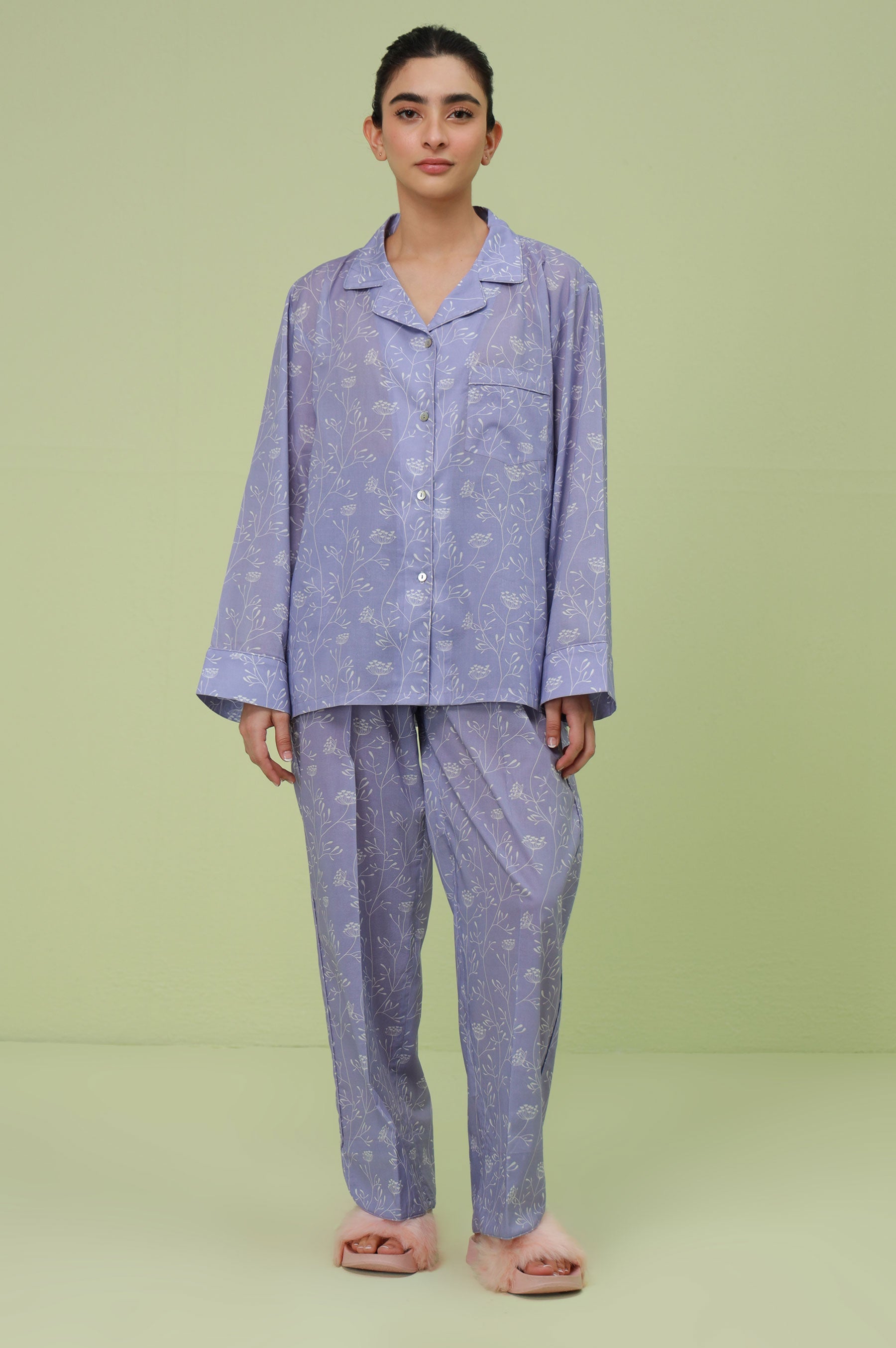 This 2-piece lilac shade woven PJ set is designed for your comfort, made from soft and breathable fabric. It features a collar neck, button-through opening, and long sleeves, paired with comfortable cambric fabric bottoms.