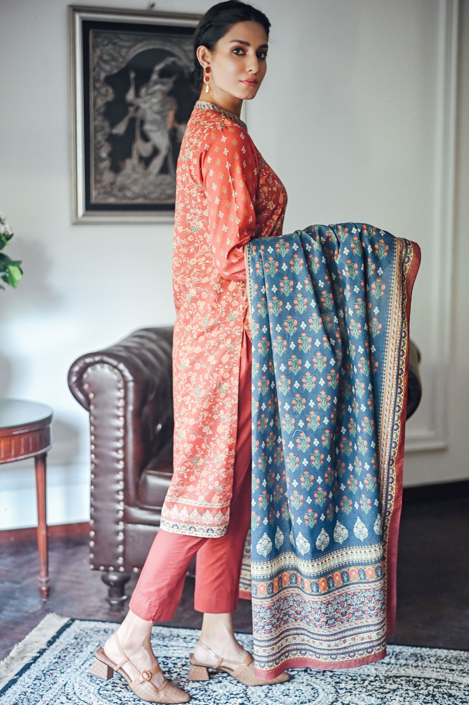 Printed Karandi Shirt, Printed Karandi Dupatta, Beads & Pearls for Embellishment.