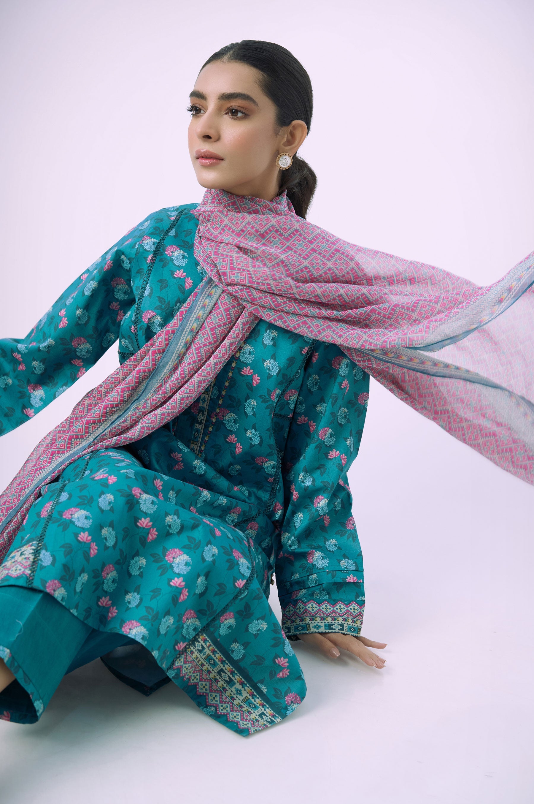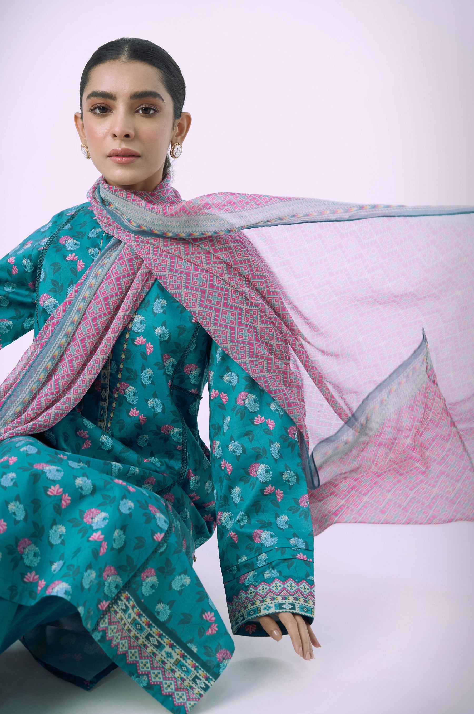Elegant styles and splendid sprays of flowers that make the colours sing. This design is beautifully paired with a colorful geometric pattern dupatta.