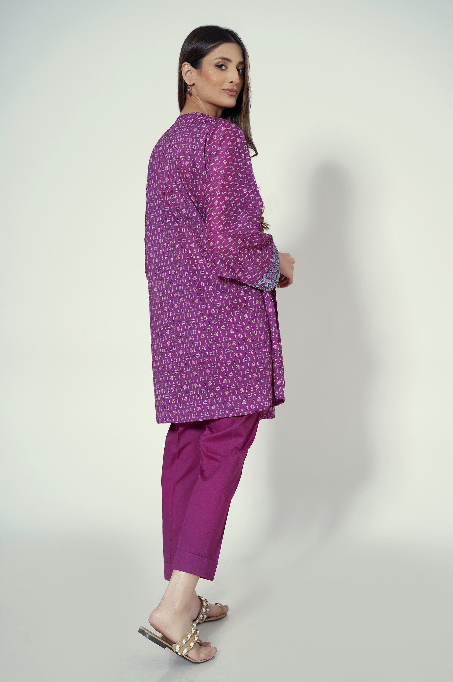 Simple yet fun an easy breezy, free sized modern shirt on a fine, with invovative block print motifs defining 21st century style with exuberant tone of purple elevated by fresh bright pink, blue and off-white paired with dyed bottom.Kurta/Shirt Design: