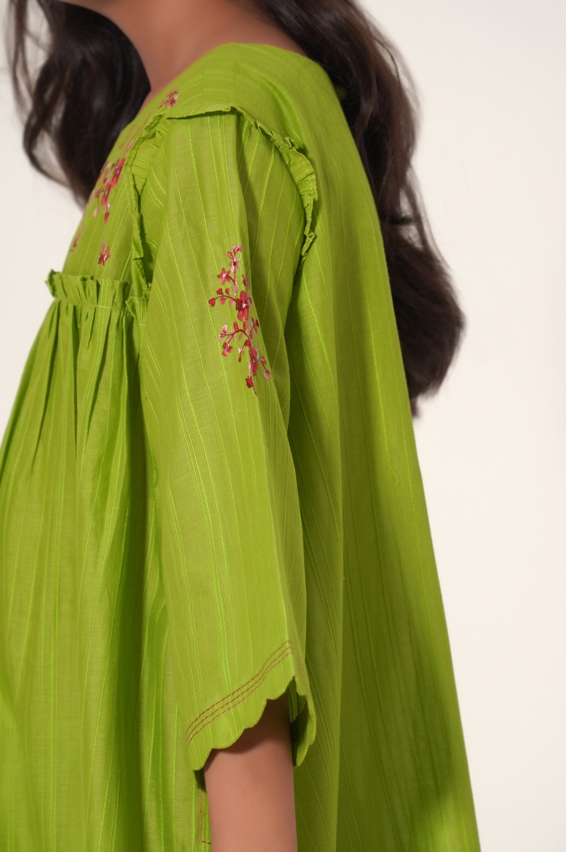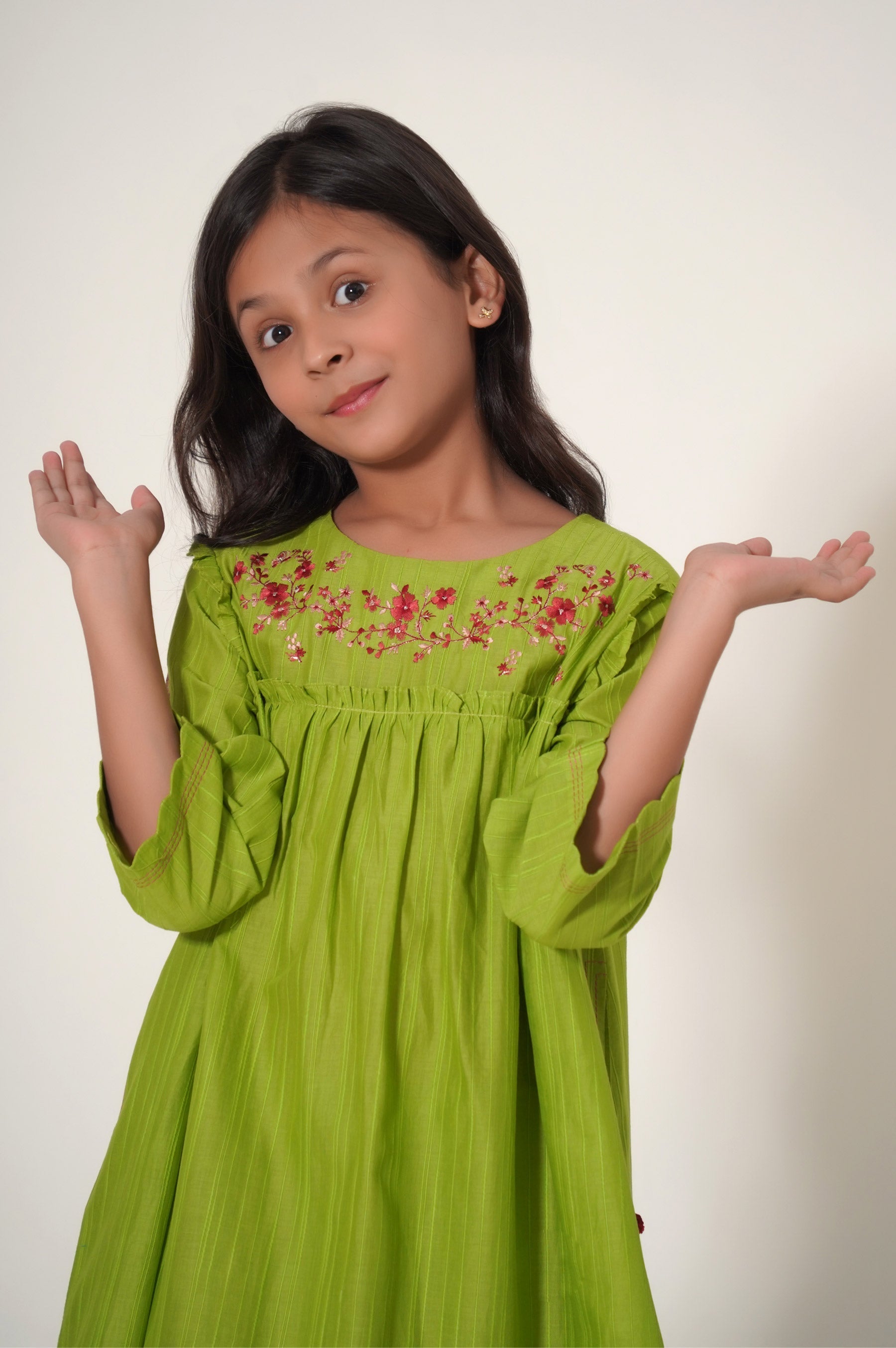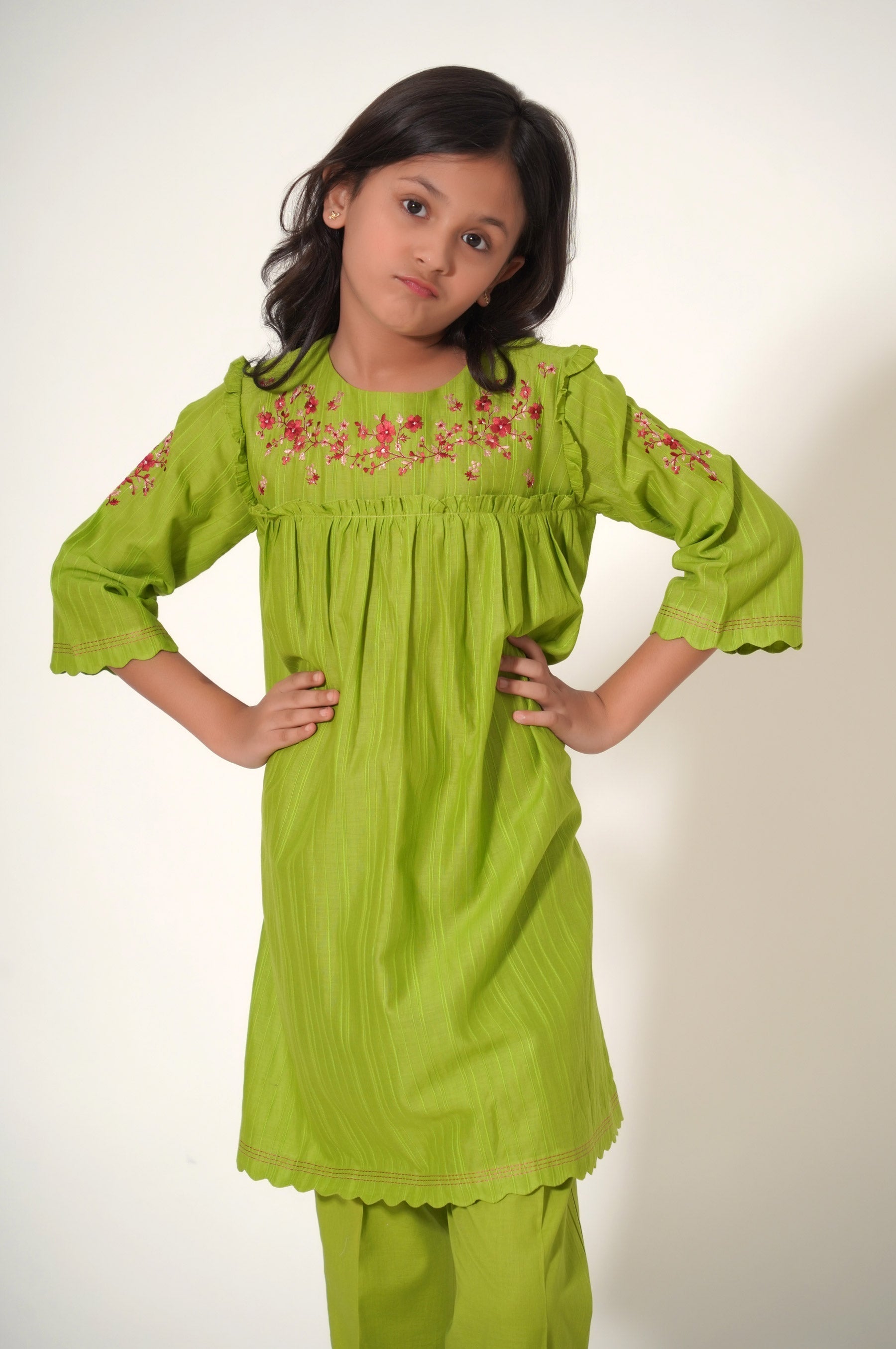 This outfit is composed in green shade with floral embroidery on the bodice and sleeves, added with scallop details. The outfit paired with Capri style bottom to make your little one's adorable this season.