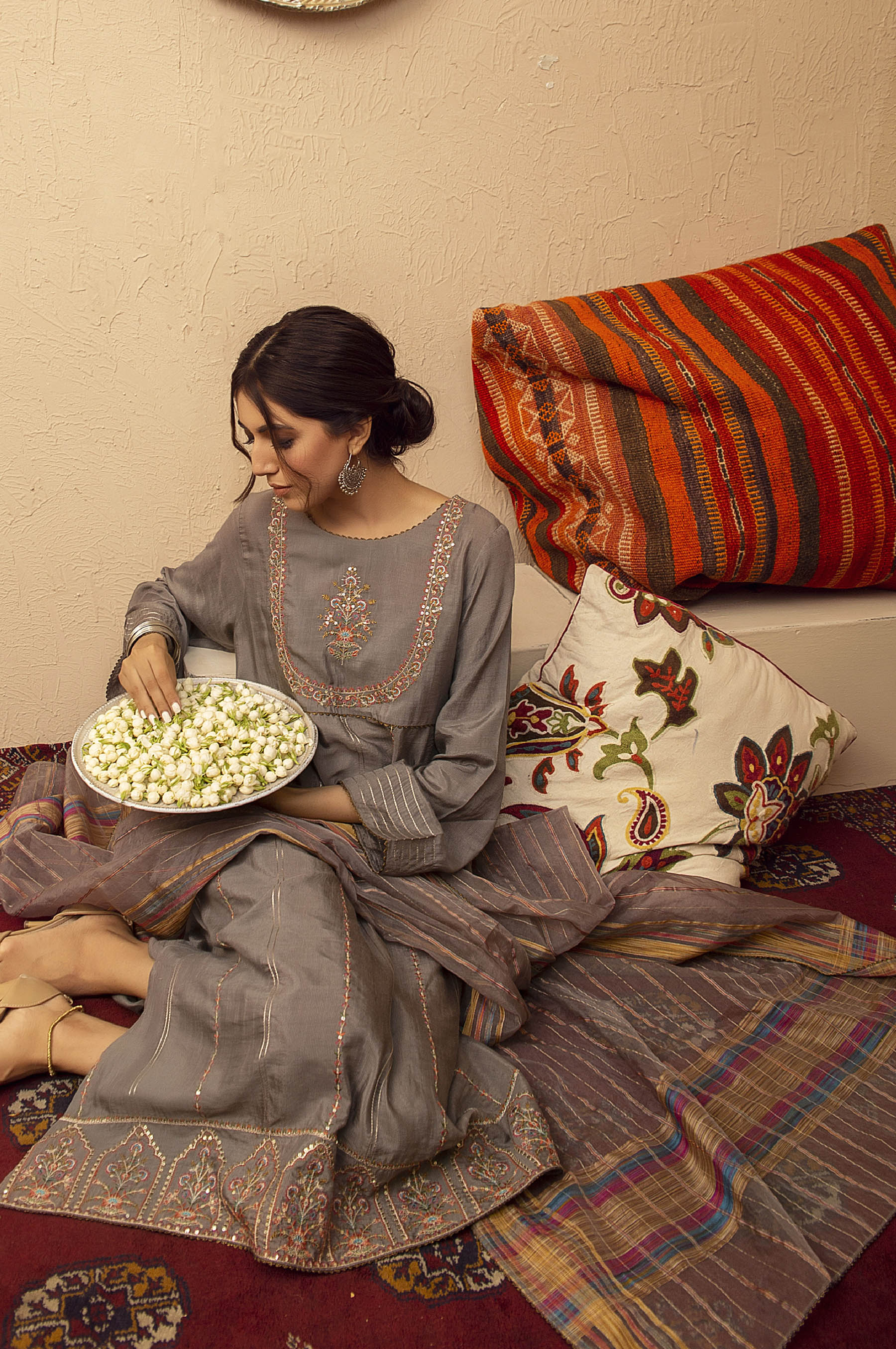 Embroidered shirt with panels and boddice embellished with laces and running stitches. Full sleeves with stitches and laces embellishment. Paired with embellished dupatta.