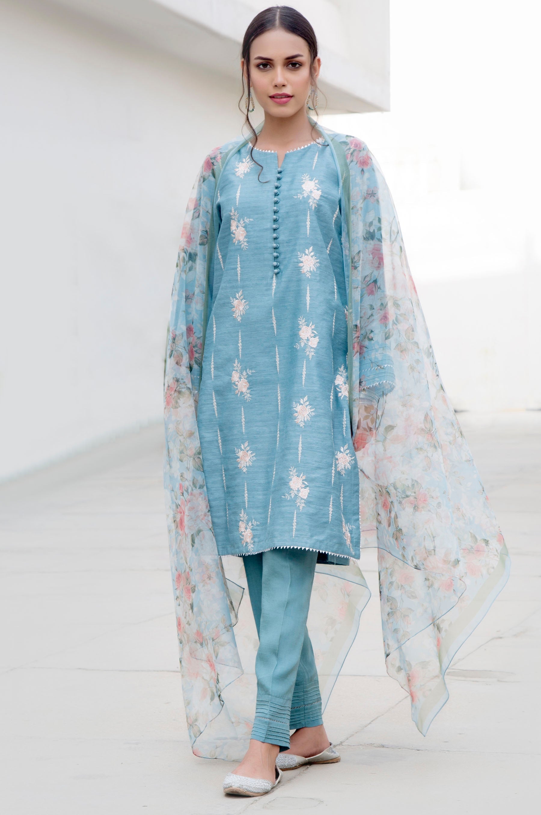 Slub Raw Silk Embroidered Shirt, Organza Digital Printed Duptatta