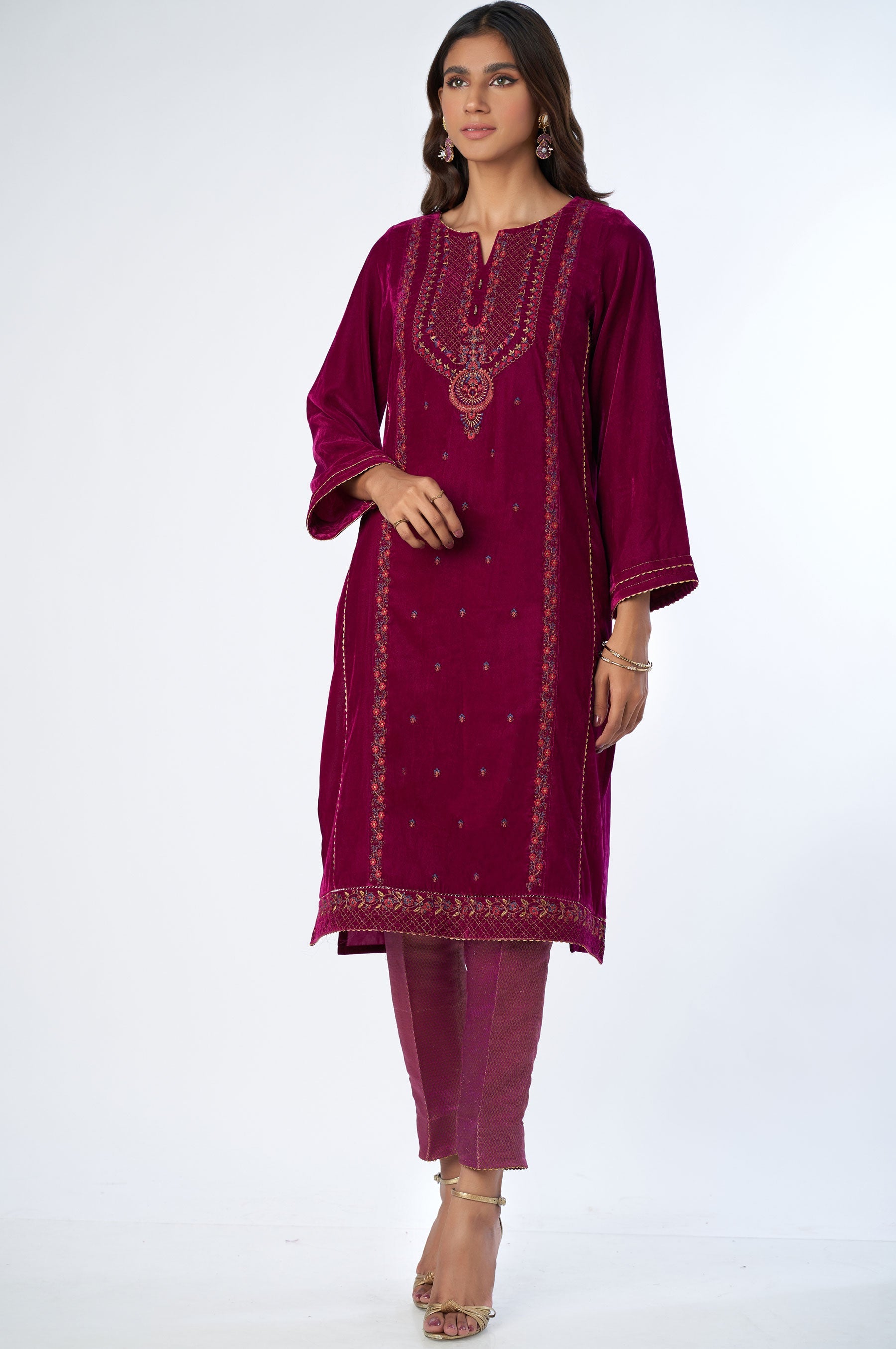 A classic 2pcs elegant composition is portrayed on this charming fuchsia velvet. Enhancing its beauty is the intricate embroidery on shirt and paired with jamawar bottom to shine in the crowd this season