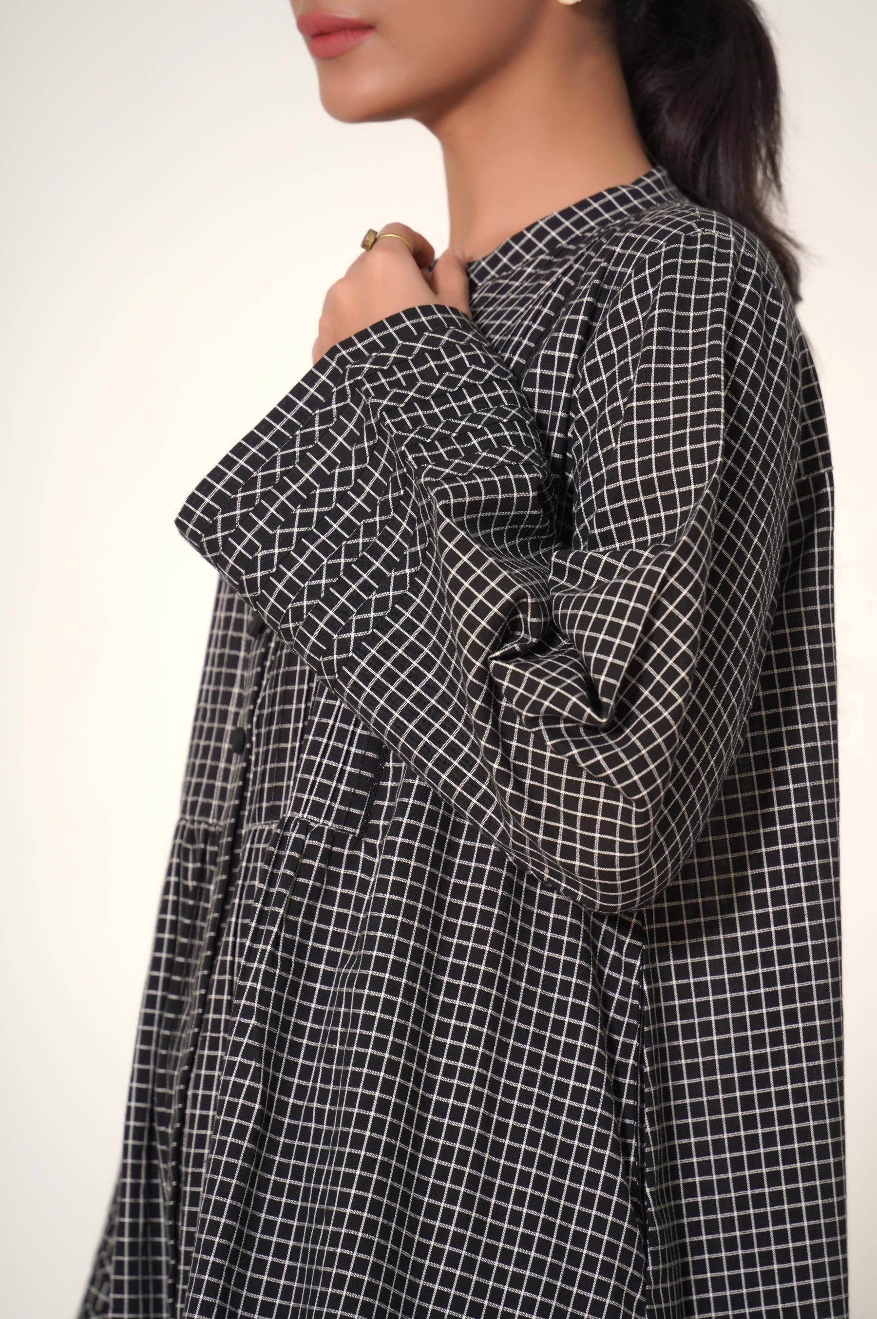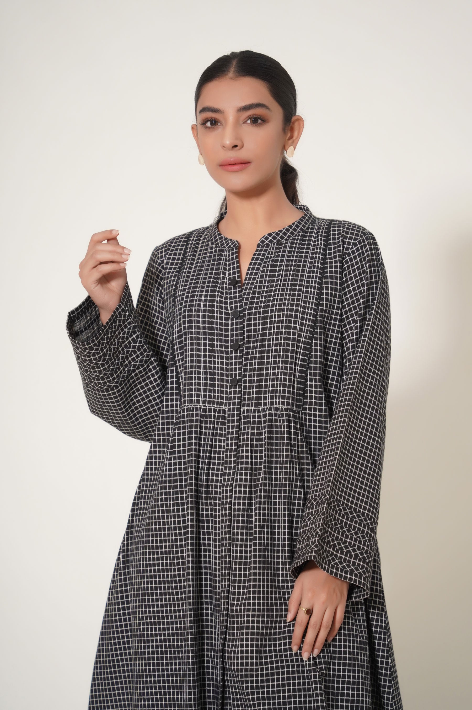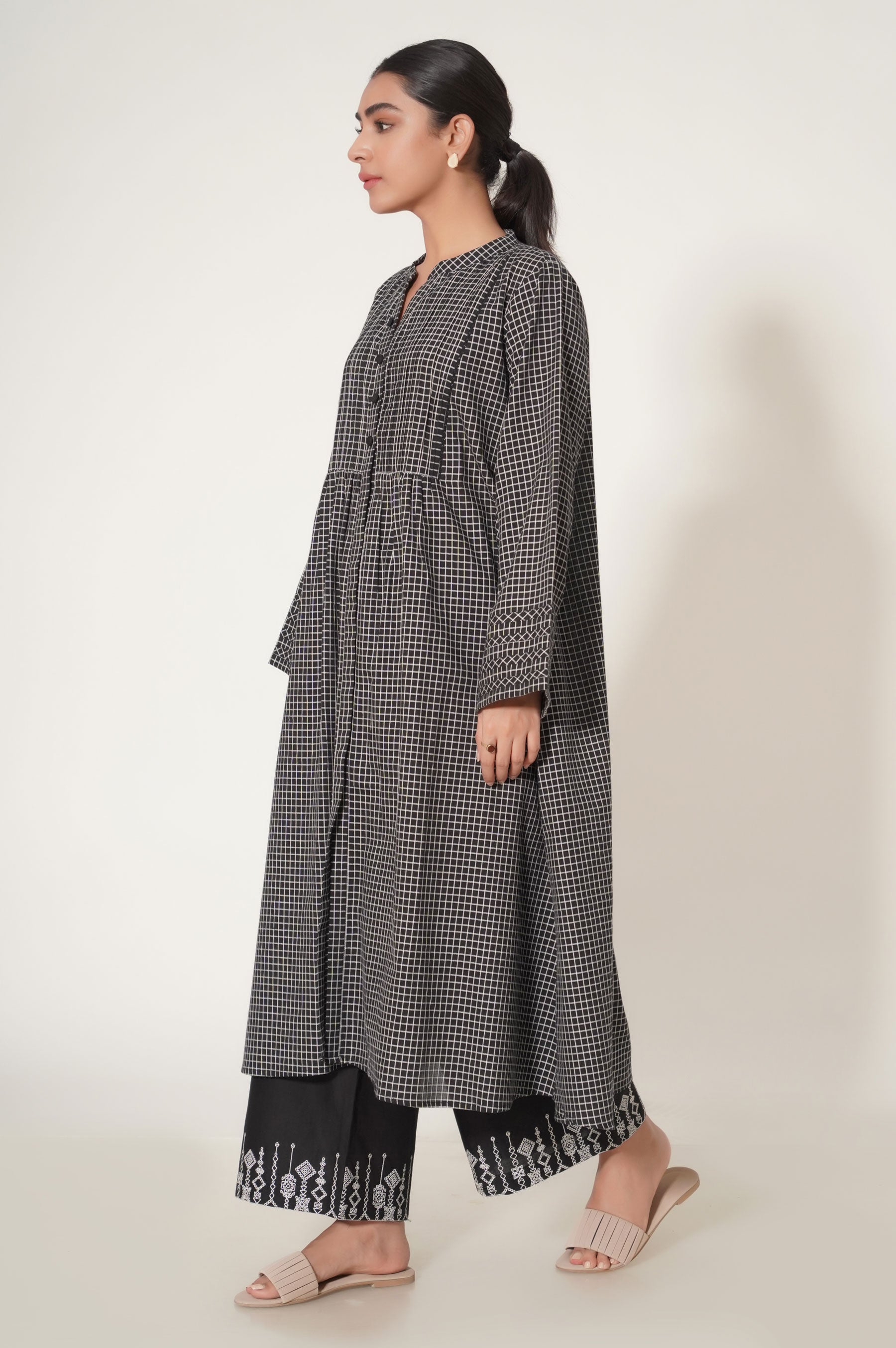 The black and white checks ensemble designed aesthetically with stylized shirt and black embroidered culotte inspired by geometrical embroidery on the hemline. The shirt compirses of band collar with v slit including pleats, lace and button details. This chic outfit will definitely be your favourite this season.