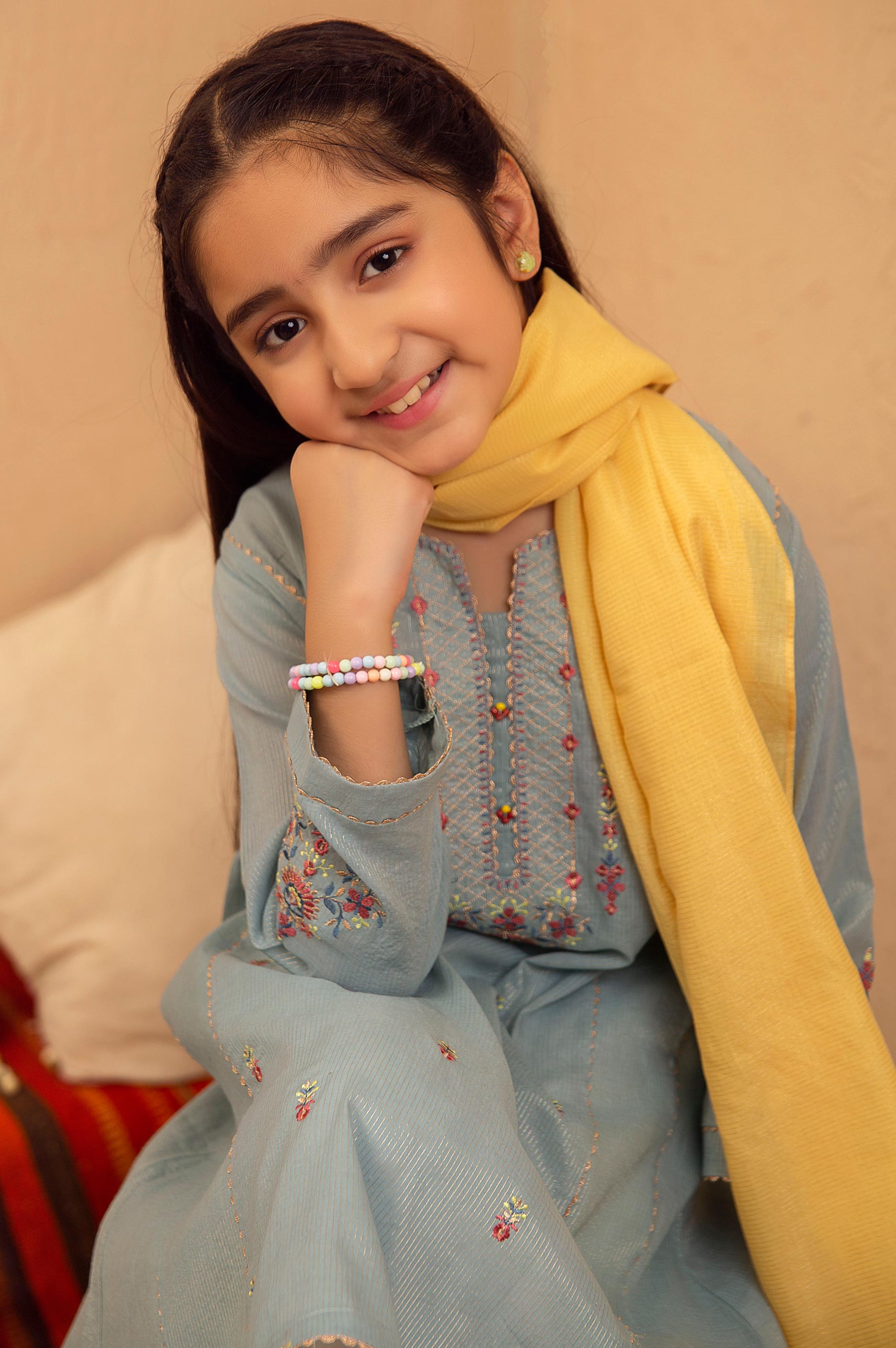 A-line shirt with embroidered neckline and motifs in the front. Embellished with beads and tassels and a contrasting yellow dupatta is the hottest pick this season.