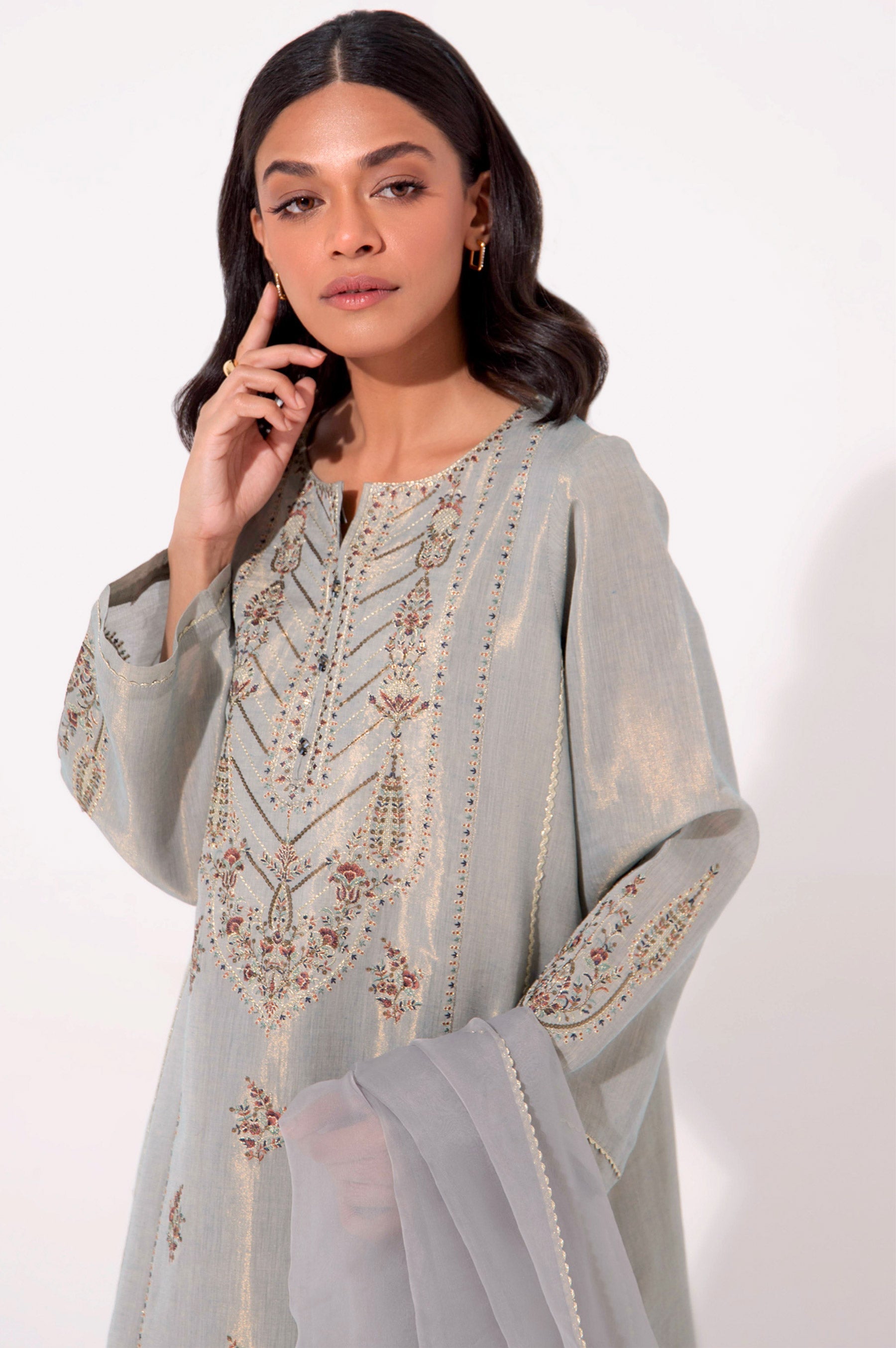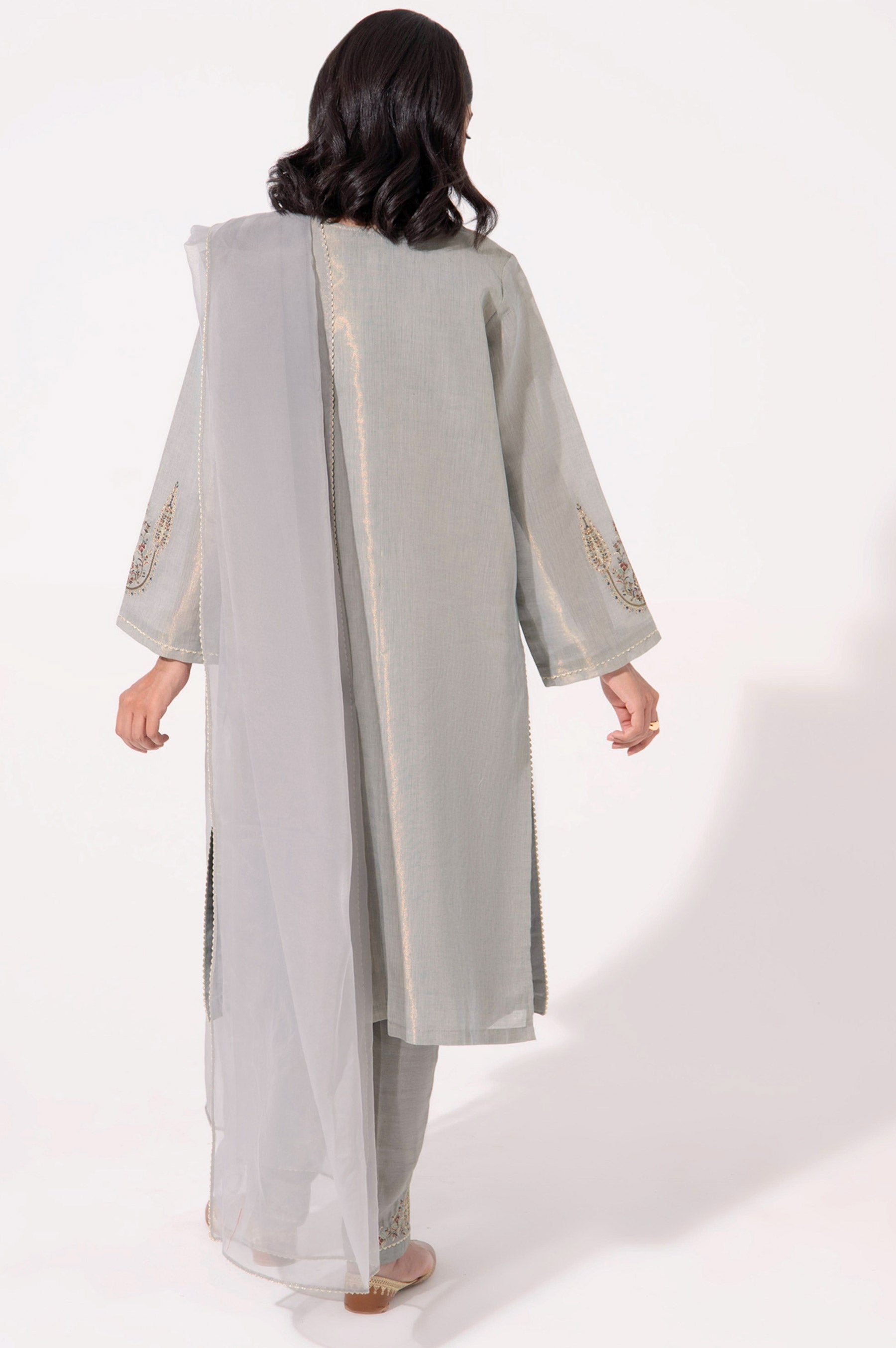 In a charming sea foam shade, this graceful 2pc ensemble features a classic shirt enriched with ethnic embroidery at front and sleeves with sequins details. Paired with embroidered bottom, this versatile ensemble will take you from day events to evening occasions.