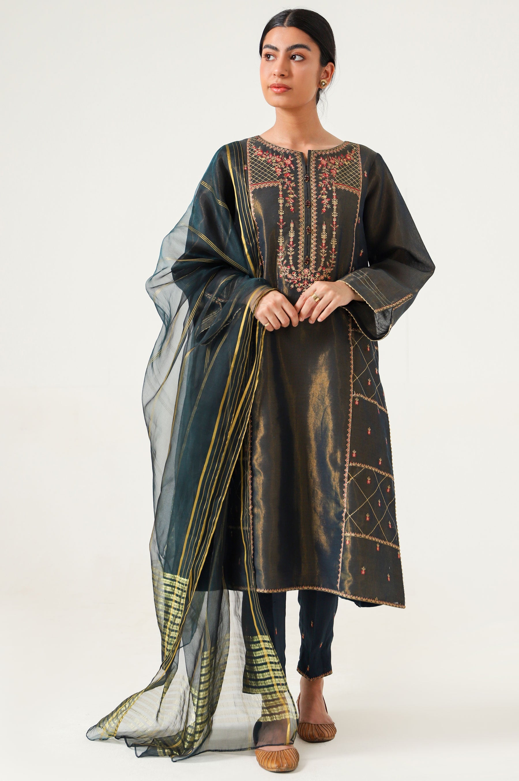 Look attractive in this embroidered Mysuri outfit, rendered in an appealing blue shade, paired with an organza woven gold zari dupatta. Portraying a mesmerizing dainty floral embroidery on shirt and bottom, style this gorgeous outfit with your favorite earrings and be the epitome of grace.