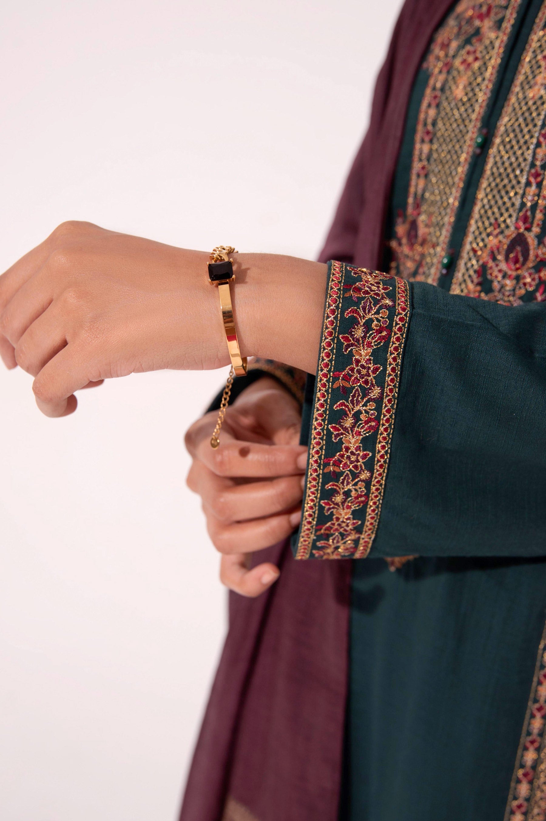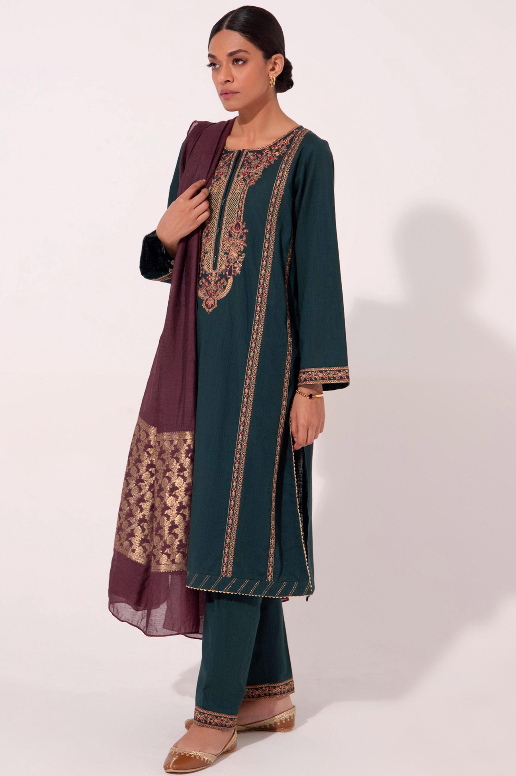 Make an appealing statement in this aesthetically rich forest green cotton slub ensemble, featuring exquisite Mughal inspired embroidery. Paired with an embroidered bottom and jacquard dupatta, look supreme in this regal design that can be styled in numerous ways to make heads turn in this season.