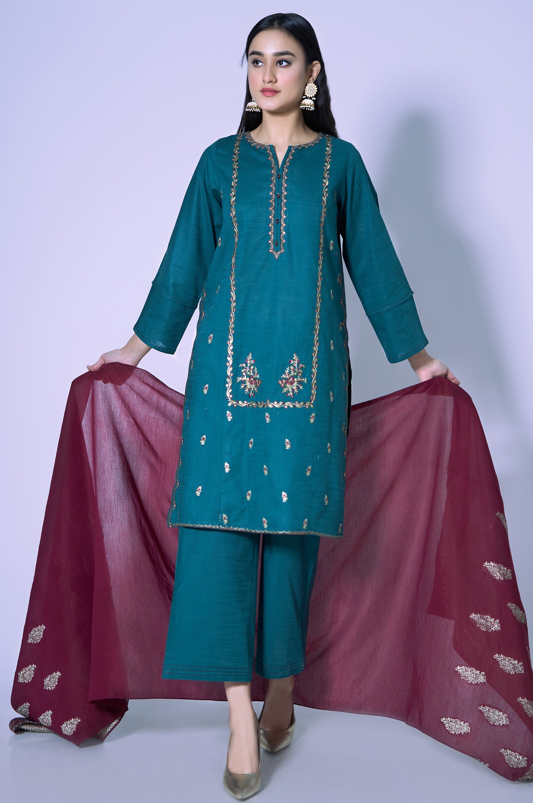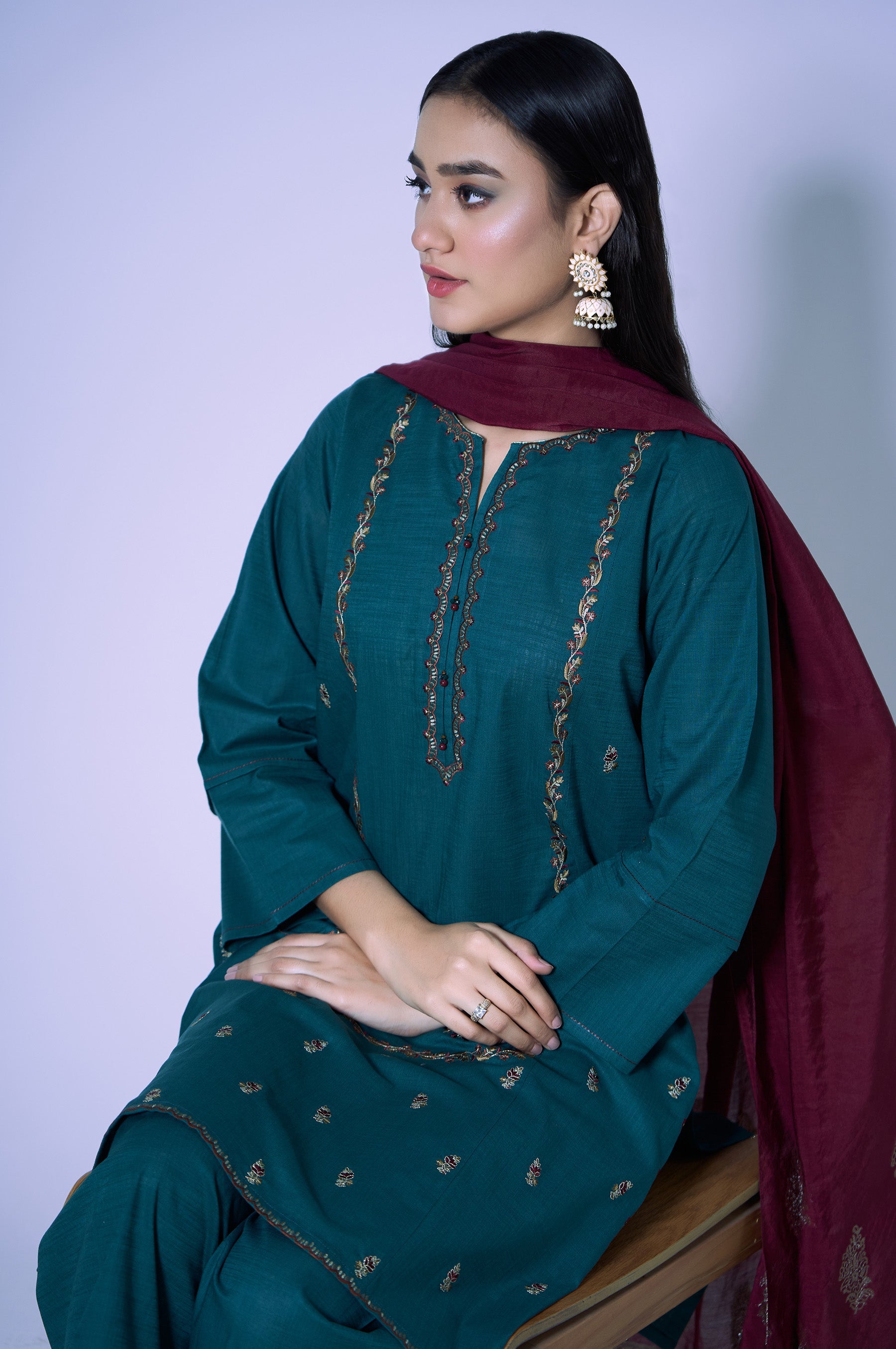 Stitched 3 Piece Cotton Slub Embroidered Outfit