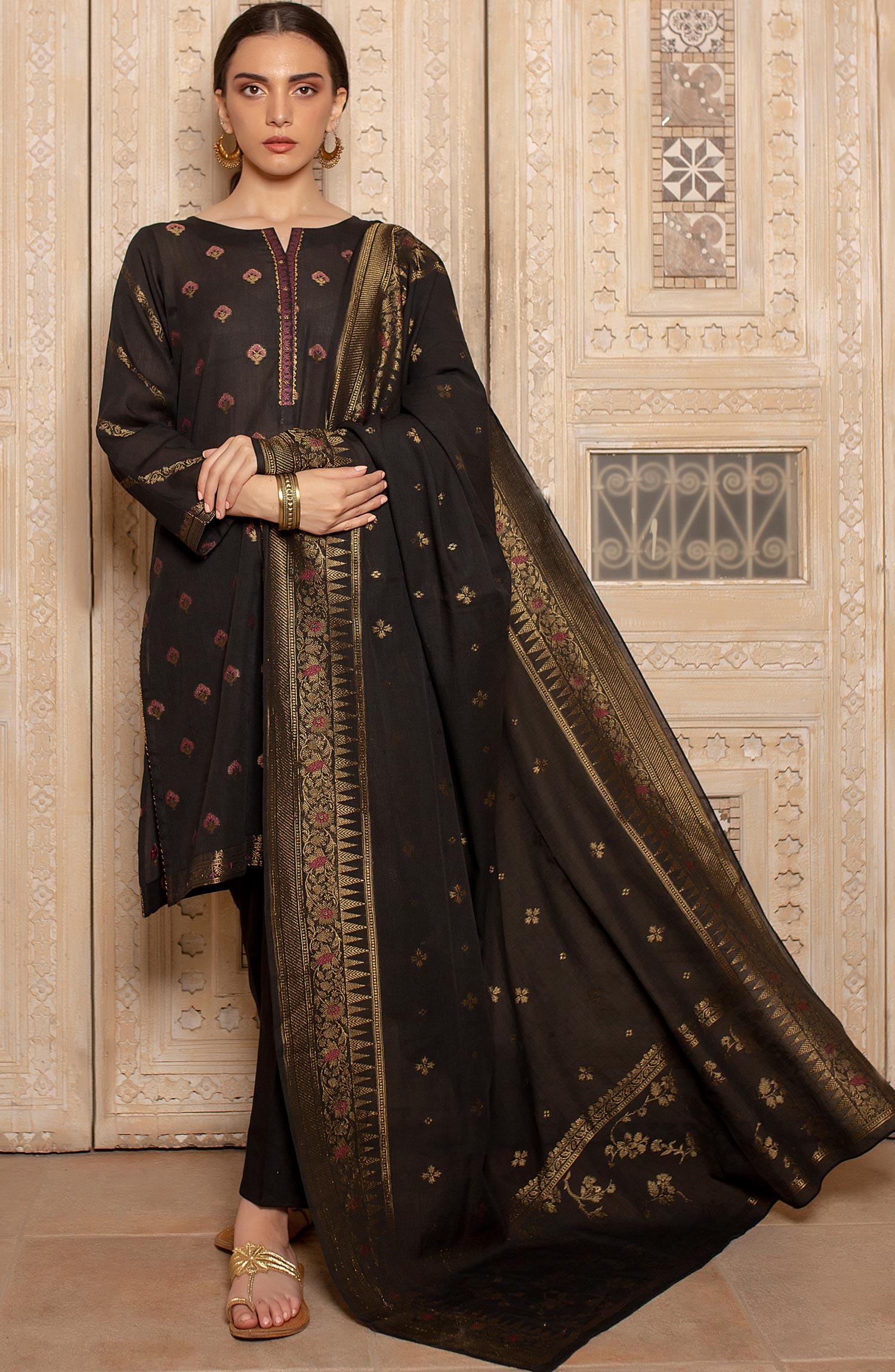 Dyed Jacquard Shirt, Dyed Jacquard Dupatta, Dyed Cambric Bottom, Lace & Pearls for Embellishment, Fit n Finish: Fit: Regular, Length: 38"-40"