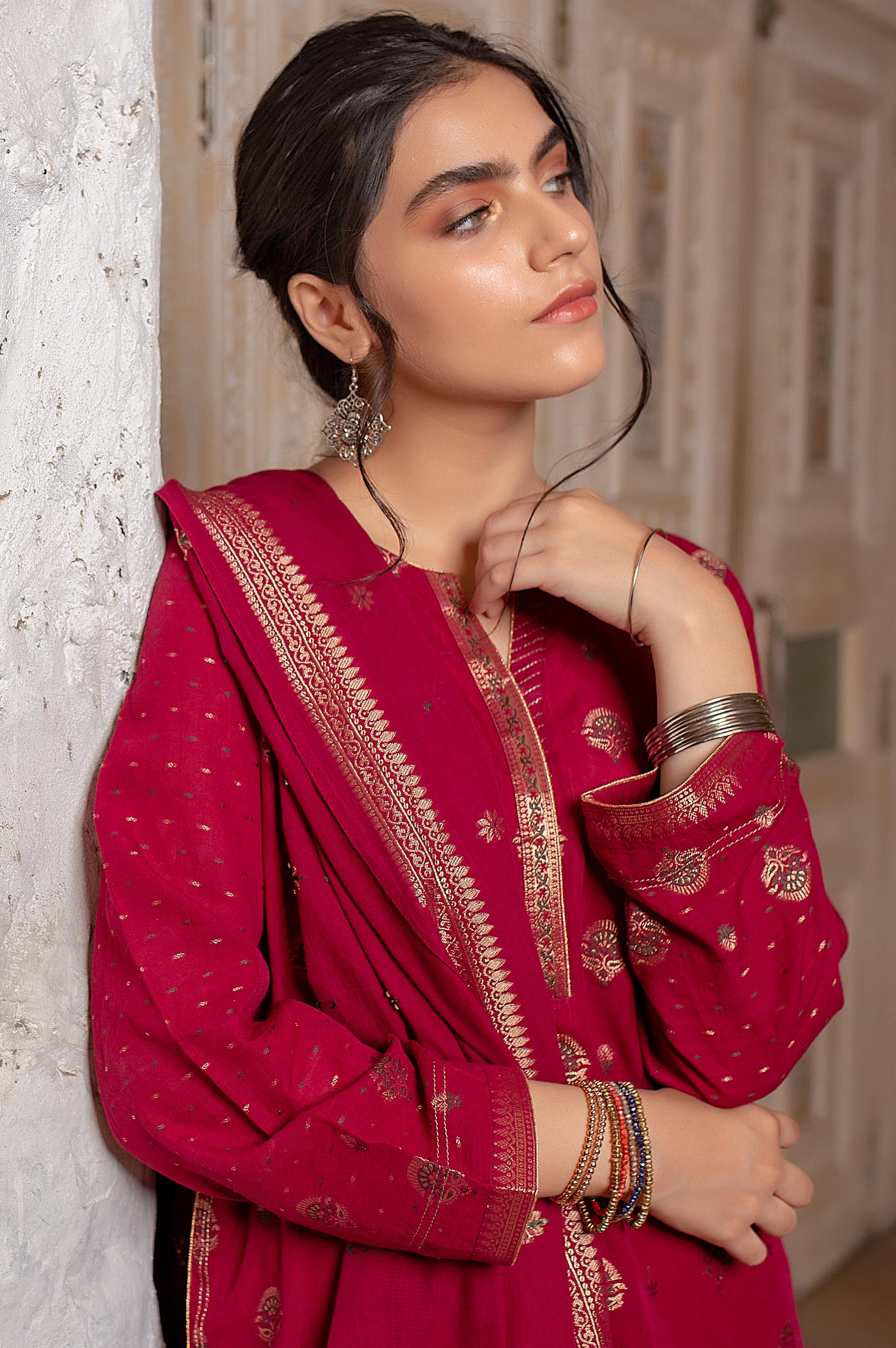 Dyed Jacquard Shirt, Dyed Jacquard Dupatta, Dyed Cambric Bottom, Buttons & Dori for Embellishment, Fit n Finish: Fit: Regular, Length: 38"-40"