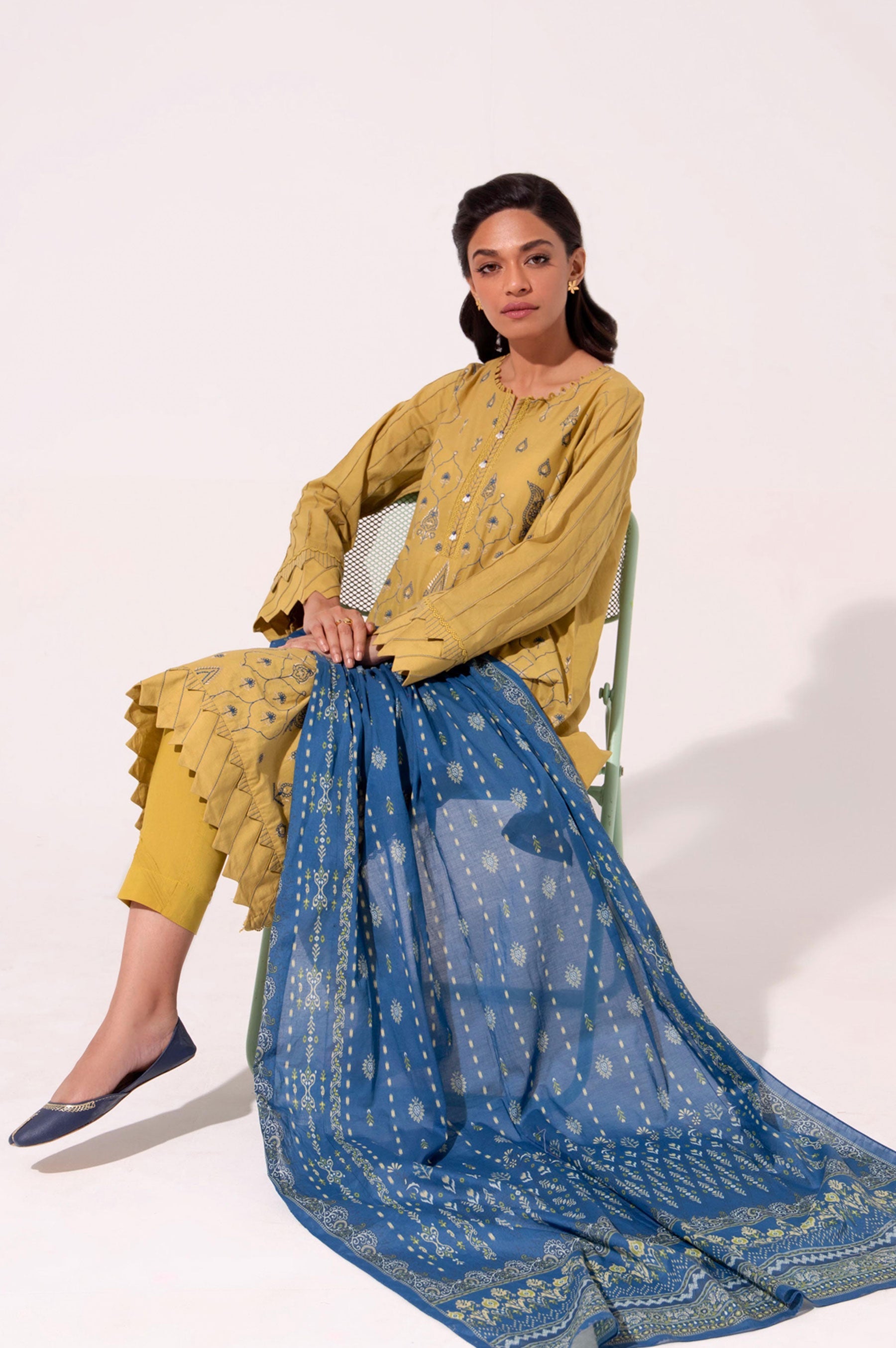 Dyed Cambric Shirt with Embroidered Front,Printed Voile Slub Dupatta, Dyed Cambric Bottom,Beads & Laces for Embellishment