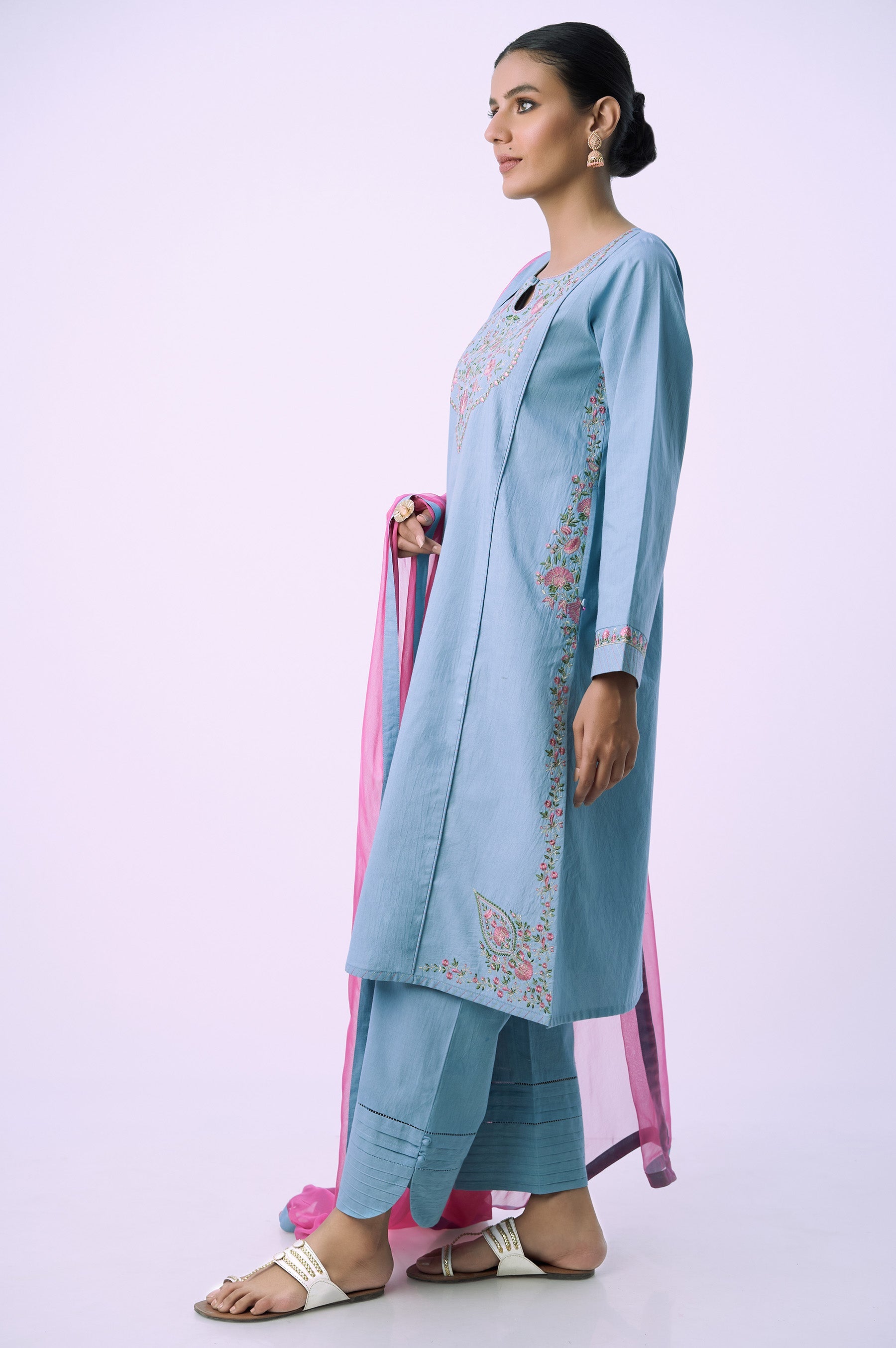 This beautiful winter sky-colored embroidery shirt is crafted with intricate detailing, showcasing an exquisite blend of traditional and modern design elements.