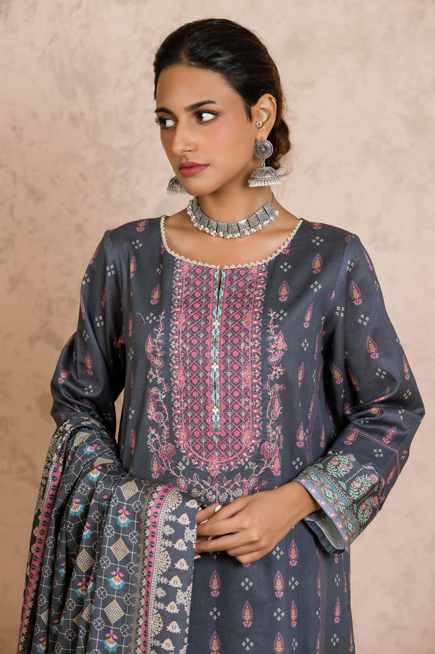 Printed Cottel Shirt with Embroidered Neckline , Printed Cottel Dupatta, Dyed Cottel Bottom, Pearls, Beads & Lace for Embellishment.