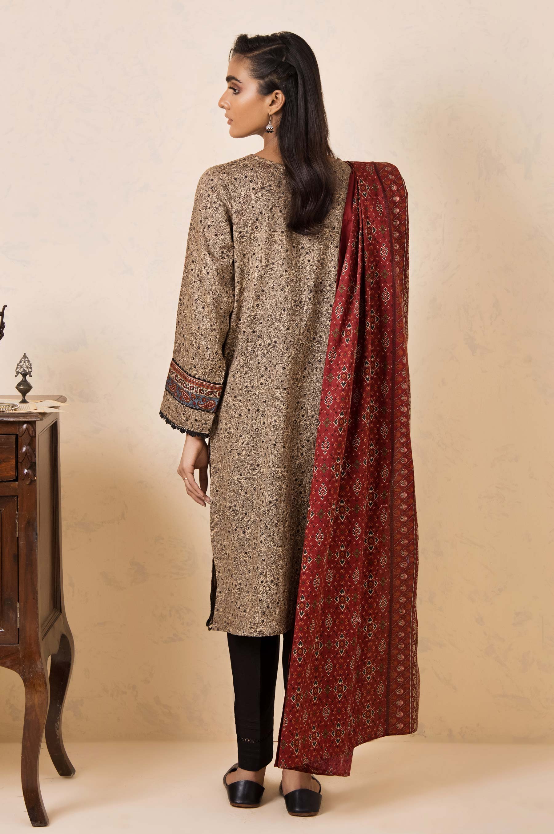 Printed Cottel Shirt with Embroidered Neckline , Printed Cottel Dupatta, Dyed Black Cottel Bottom, Beads, Pearls & Laces for Embellishment.