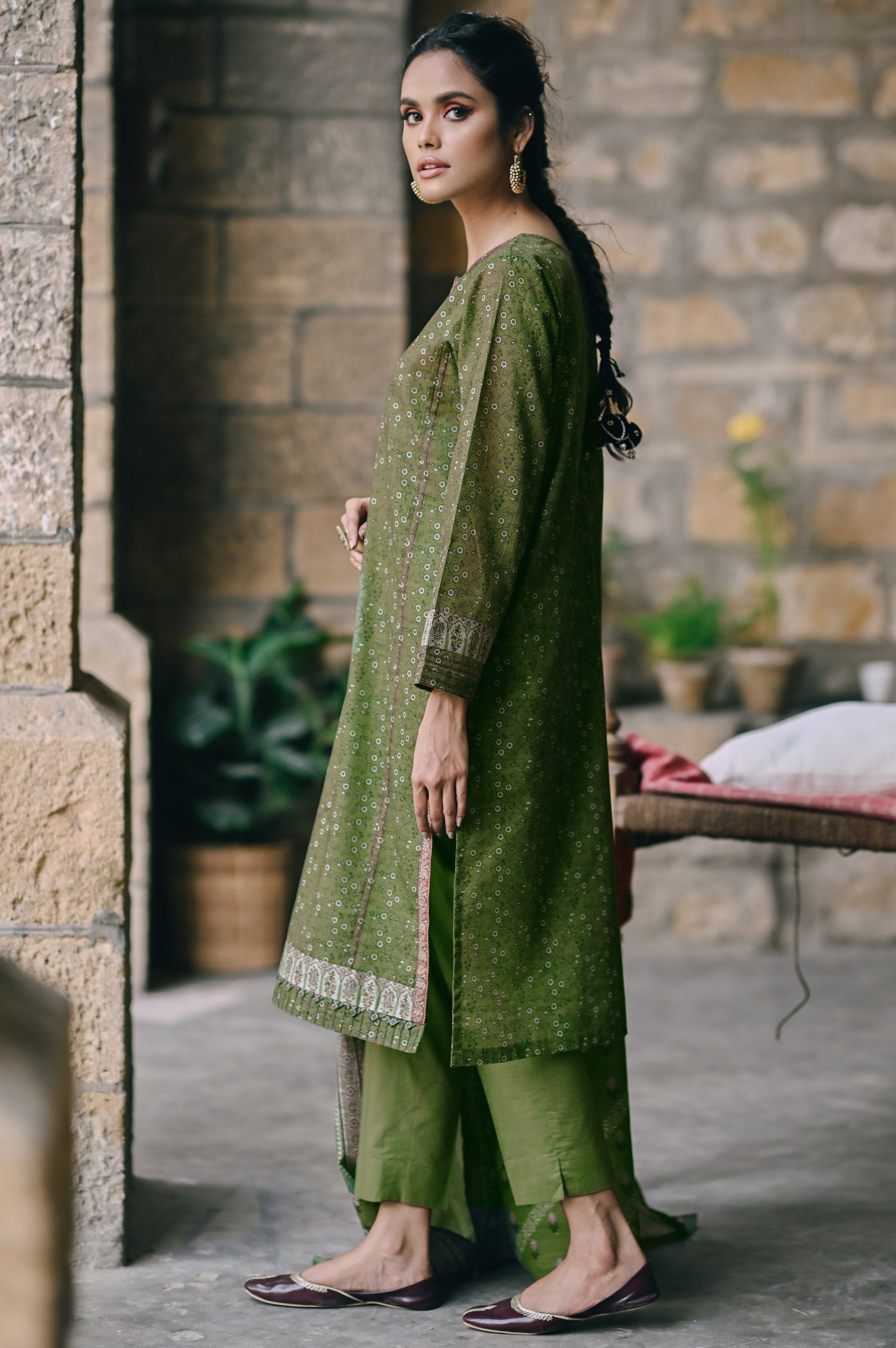 Printed Cottel Shirt with Embroidered Neckline , Printed Cottel Dupatta, Dyed Cottel Bottom, Beads for Embellishment.