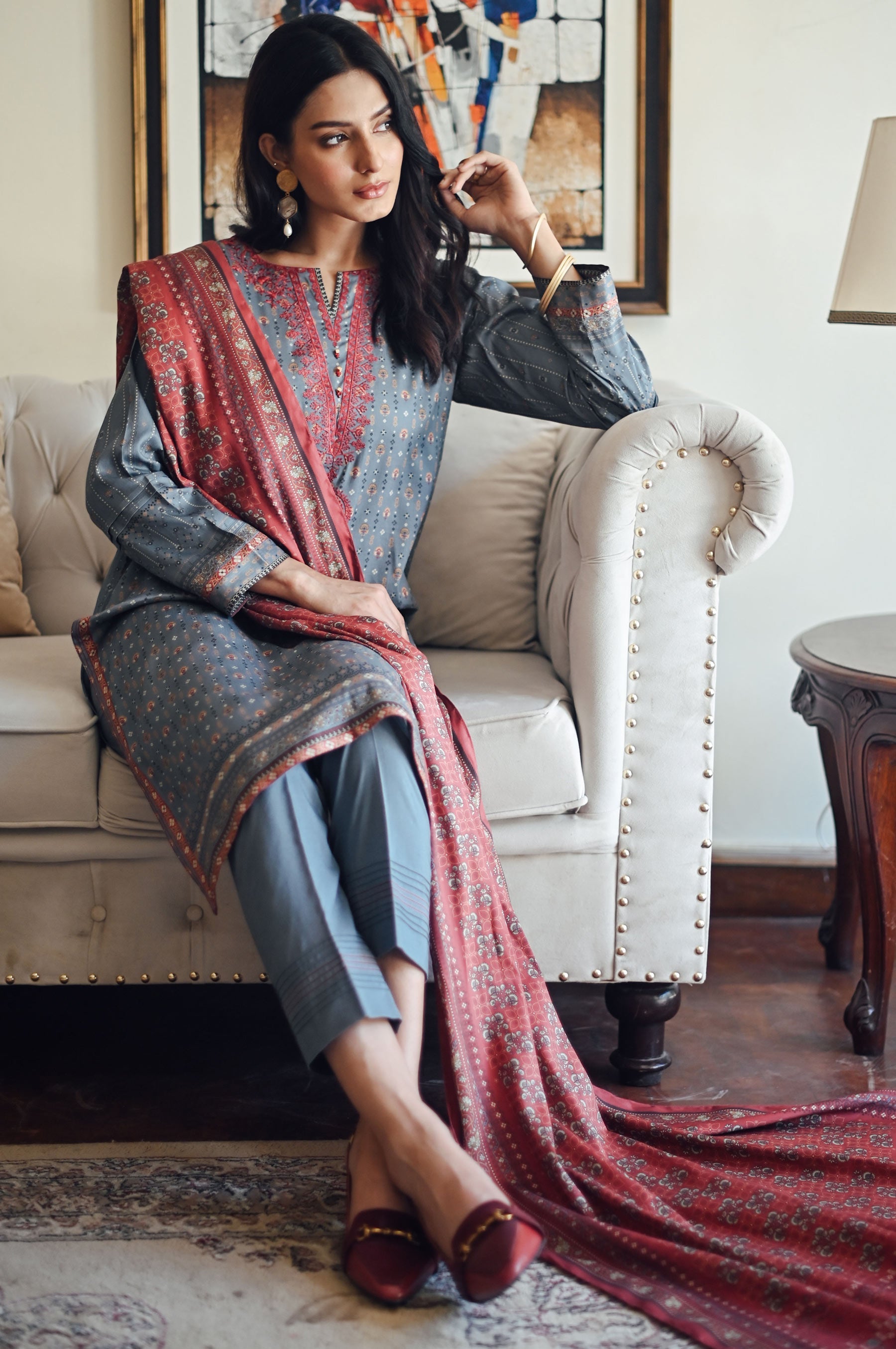 Printed Doria Linen Viscose Shirt with Embroidered Neckine, Printed Doria Linen Viscose Dupatta, Dyed Doria Linen Viscose Bottom, Beads for Embellishment.
