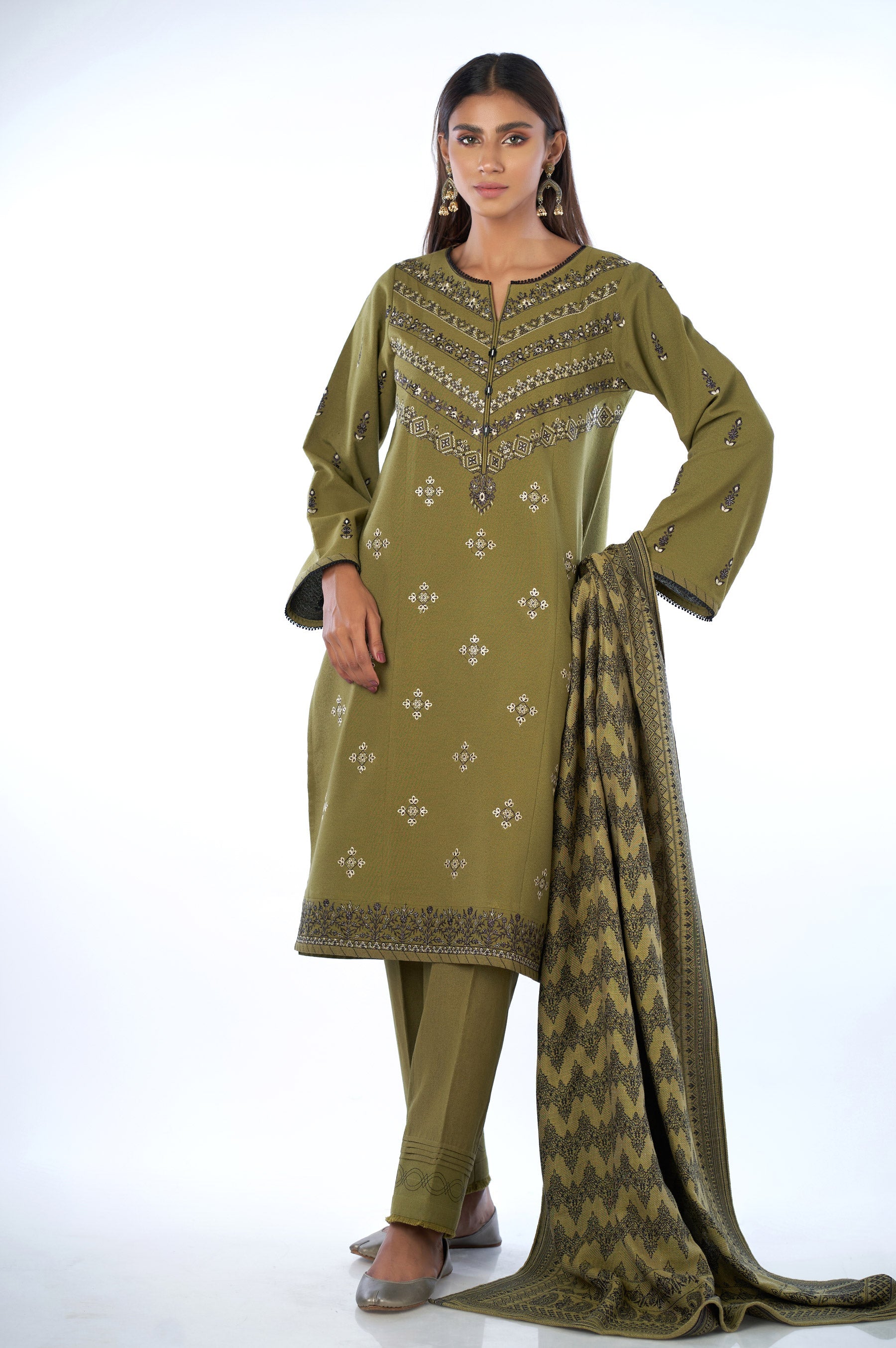 Dyed Karandi Shirt with Embroidered Neckline, Front, Side Panels, Sleeves & Border Lace, Acrylic Shawl, Dyed Karandi Bottom