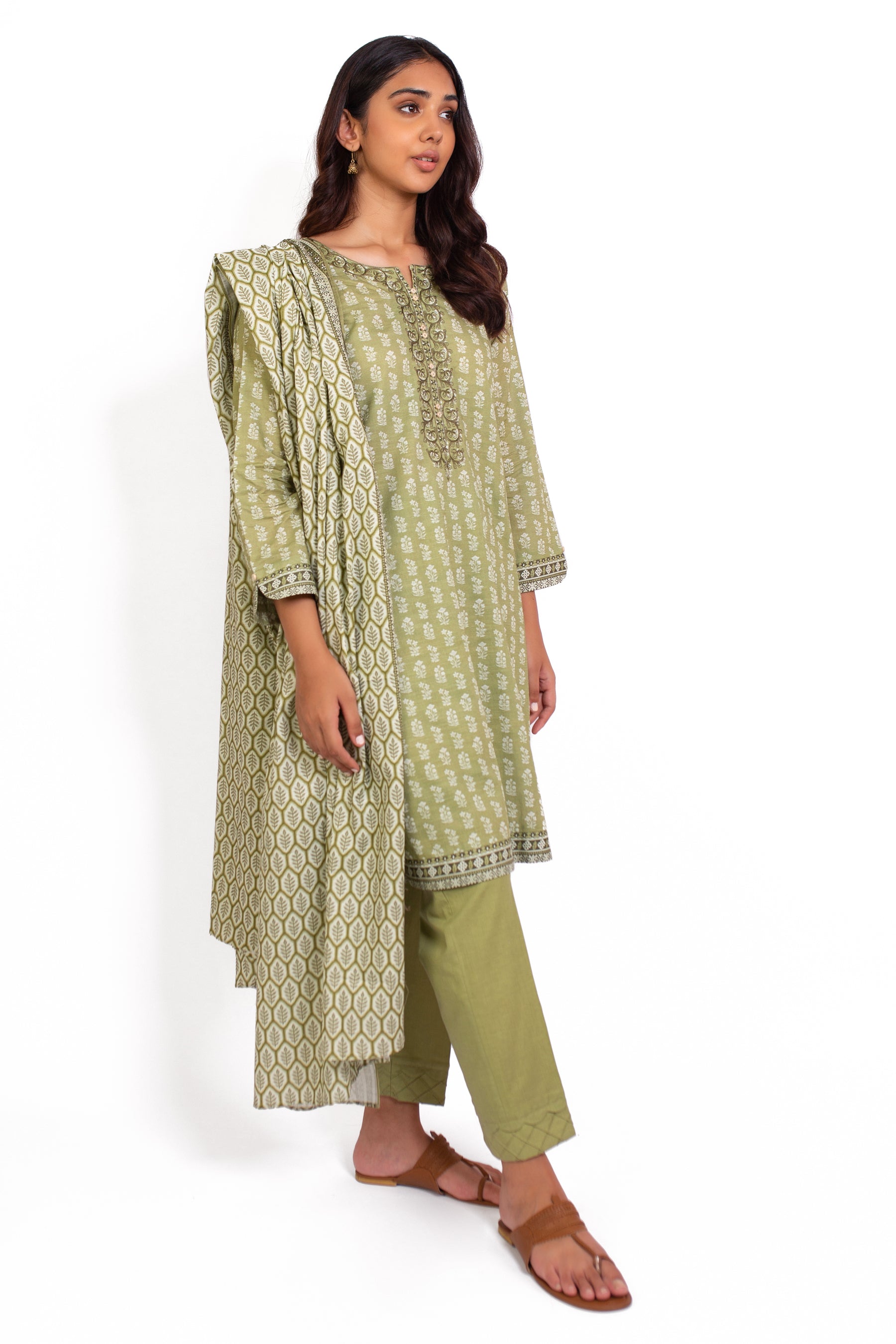 Printed Khaddar Shirt with Embroidered Neckline, Printed Khaddar Dupatta, Dyed Khaddar Bottom, Beads & Lace for Embellishment