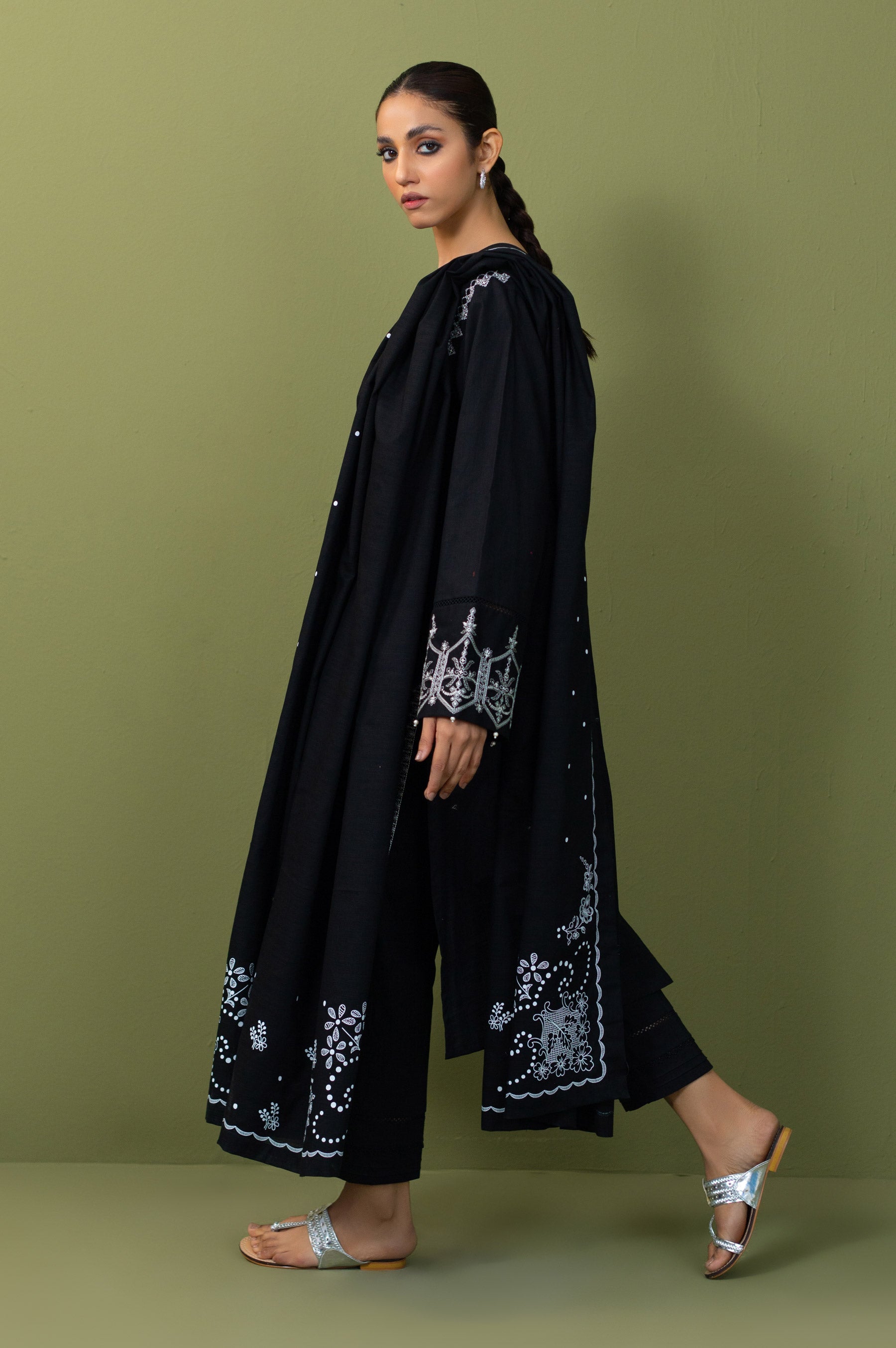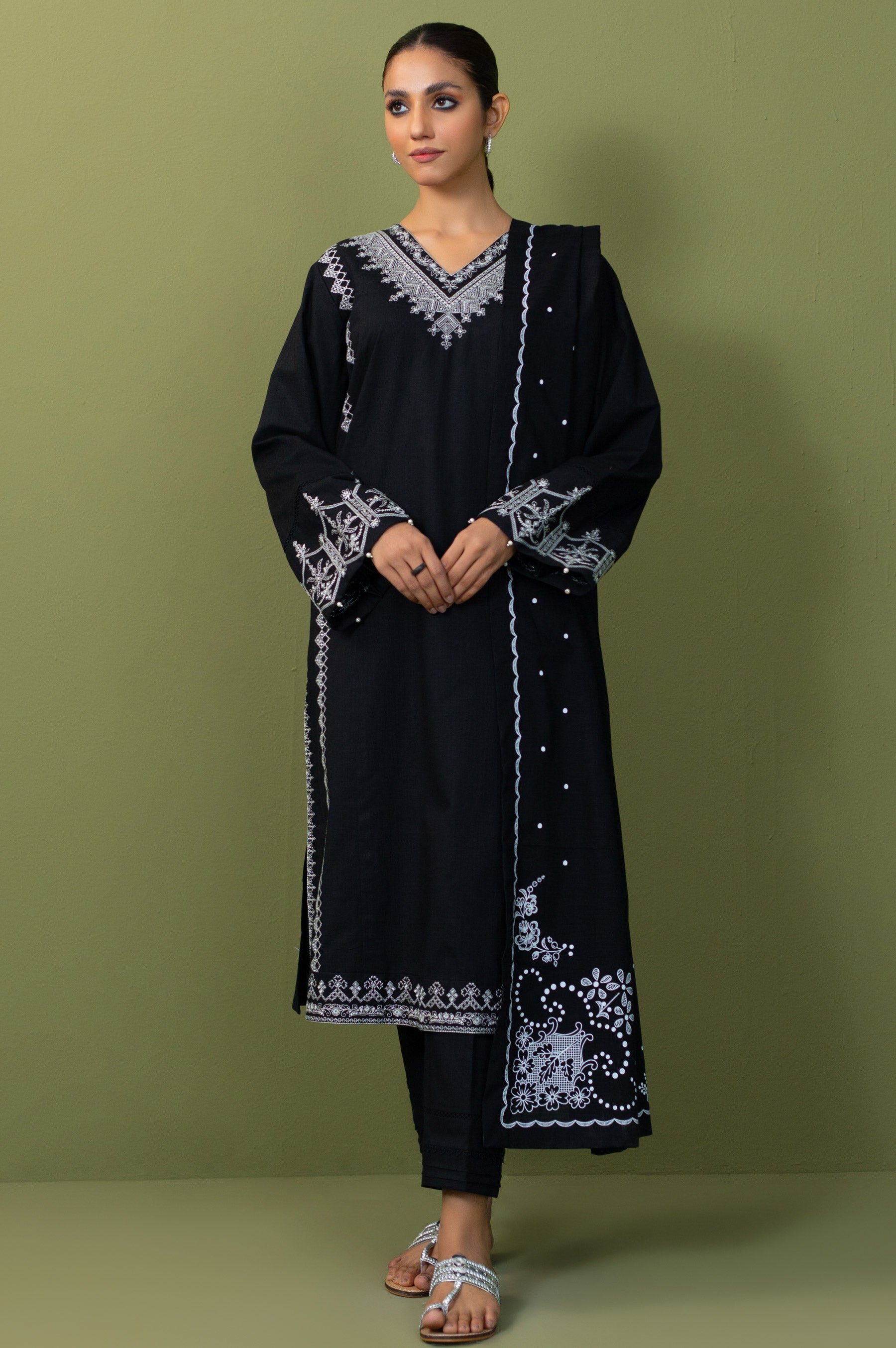 a traditionally styled attire with black-tinted geometric embroidery and a wonderfully designed patterned dupatta making it ideal for winter gatherings.