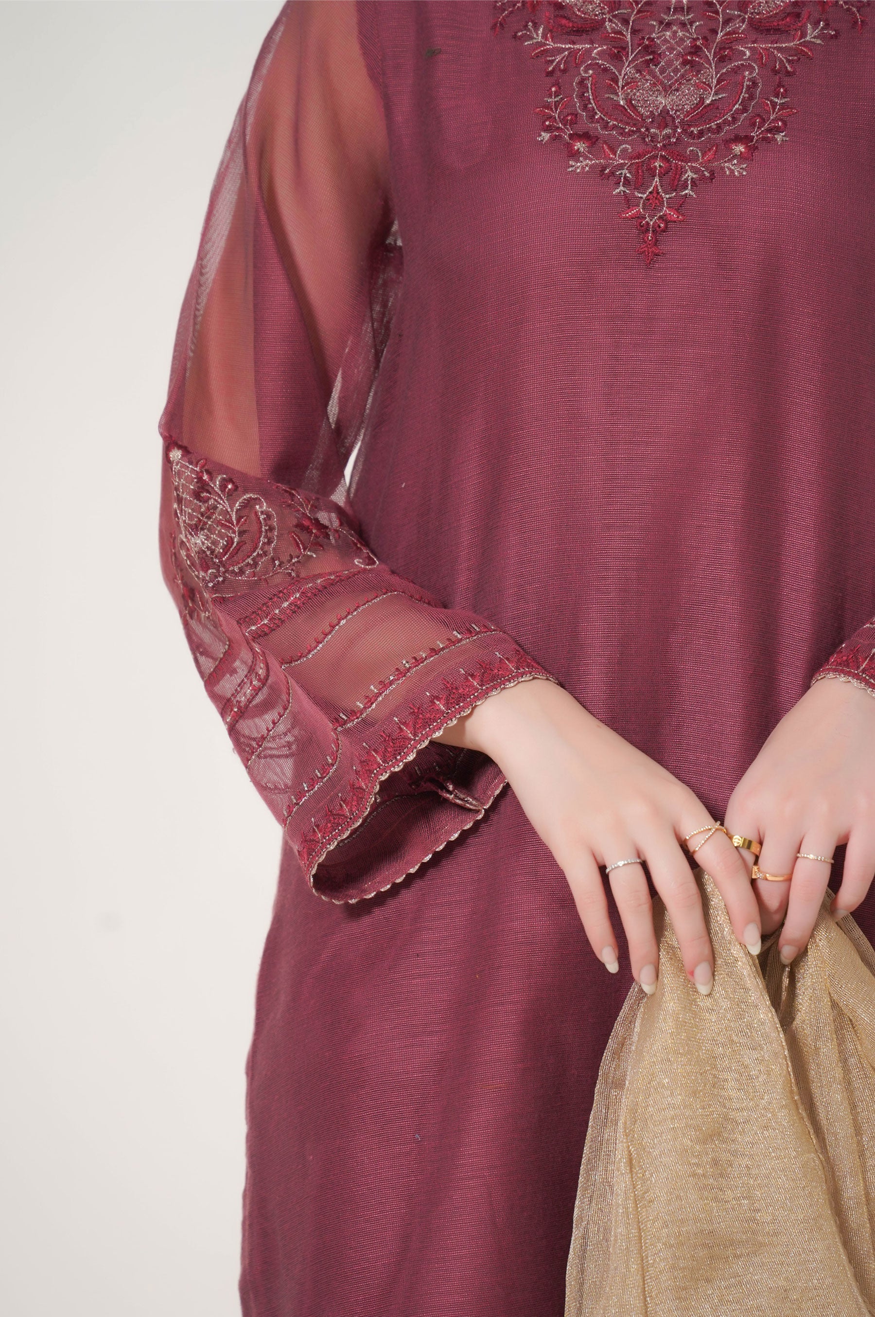 "Rendered in a pretty shade of Deep Pink,This beautiful article features embroidery on sleeves and around neck.Layered over Rawsilk straight pants and paired with a Golden zari net dupatta, this ethereal silhouette is ideal for summer festivities.