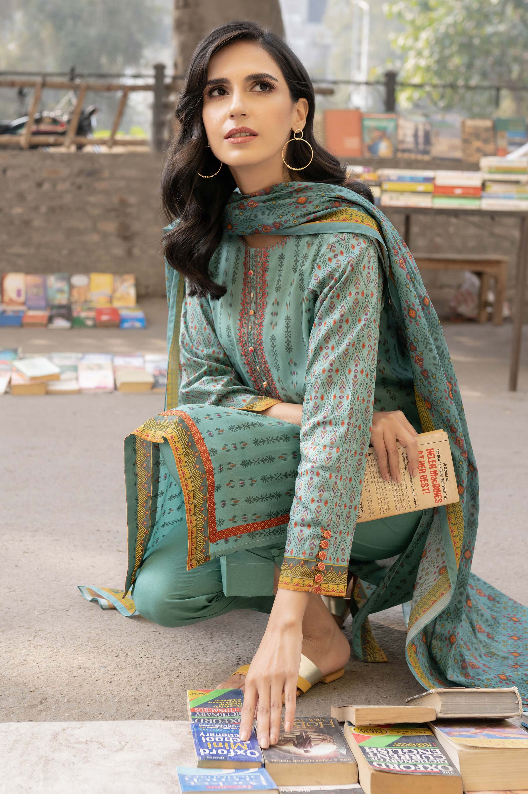 Printed Lawn Shirt with Embroidered Neckline, Printed Lawn Dupatta, Dyed Cambric Bottom, Buttons & Beads for Embellishment,