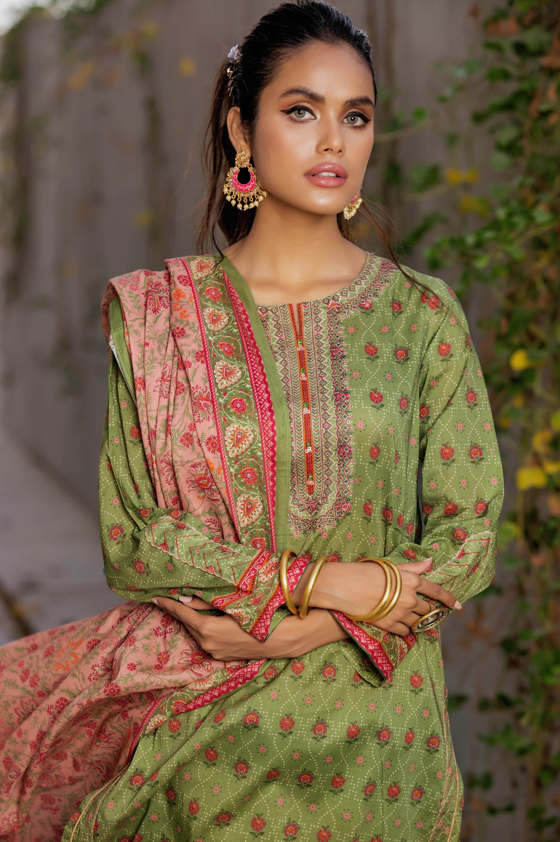 Printed Lawn Shirt with Embroidered Neckline, Printed Lawn Dupatta, Dyed Cambric Bottom,Beads, Pearls, Sequins, Dori & Lace for Embellishment