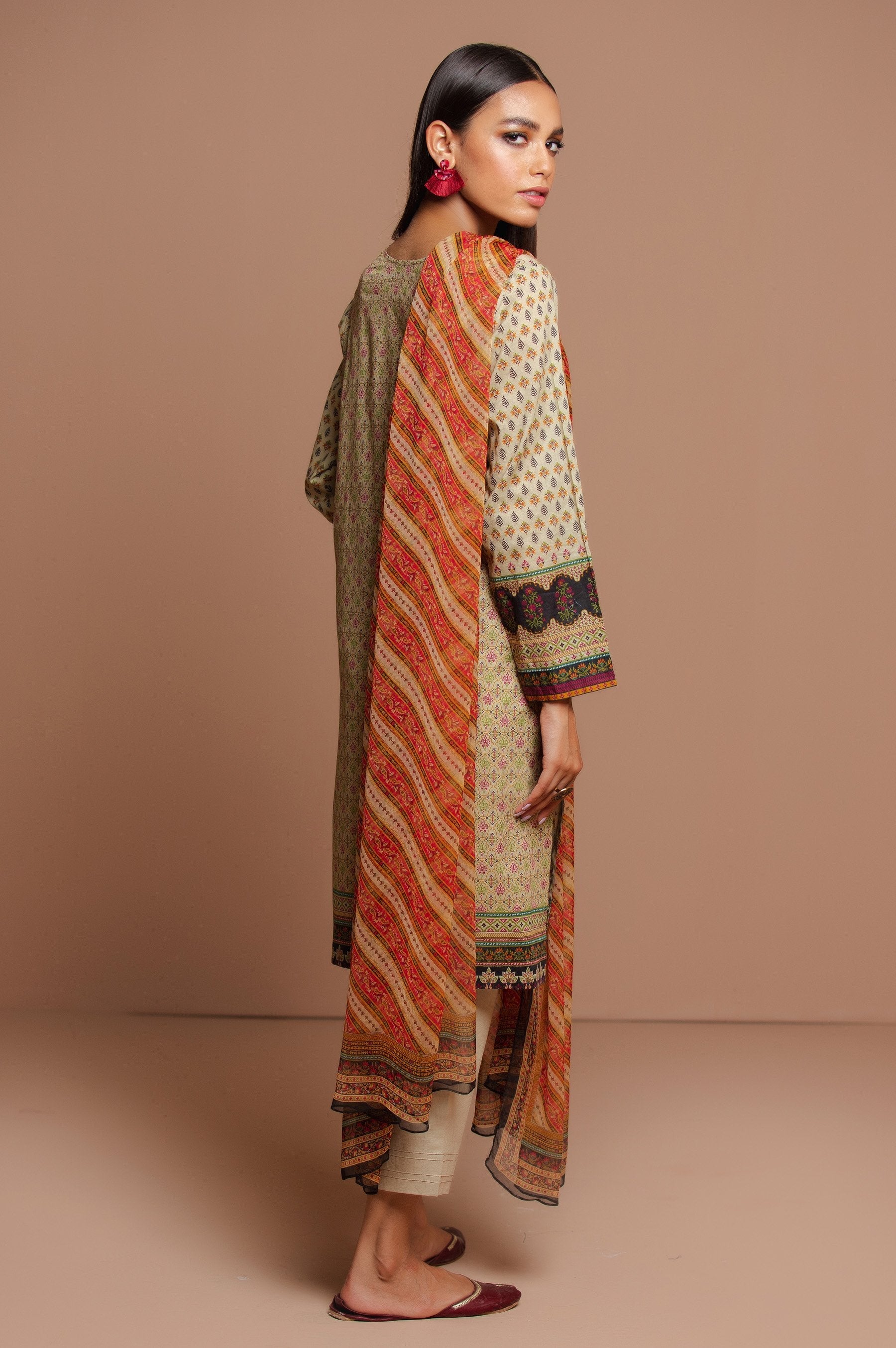 Printed Lawn Shirt with Embroidered Neckline, Digital Printed Chiffon Dupatta, Dyed Cambric Bottom.