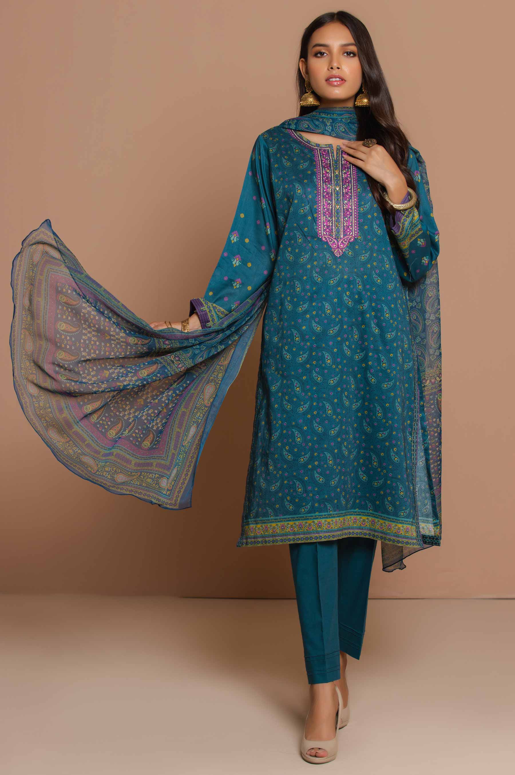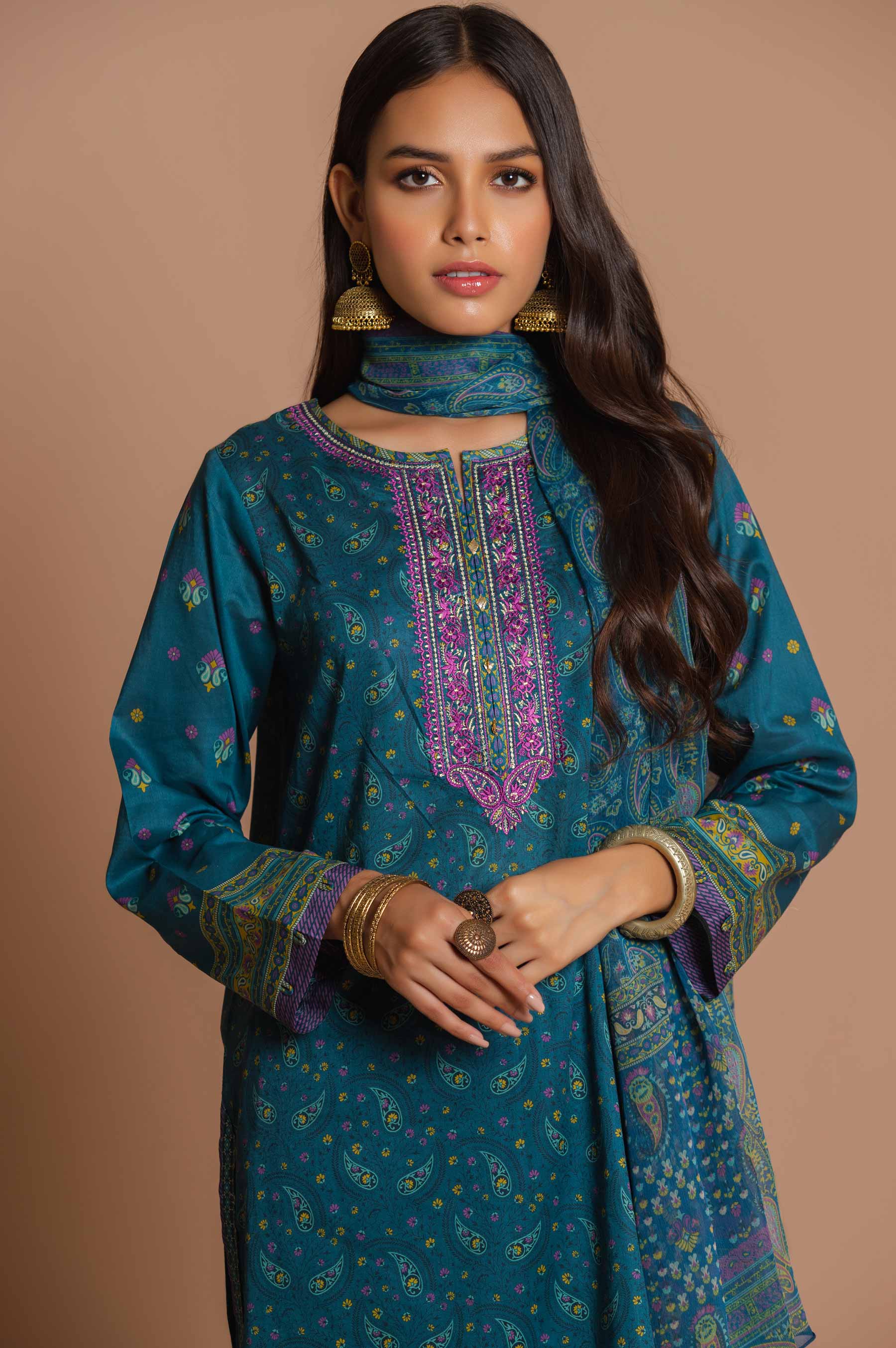 Printed Lawn Shirt with Embroidered Neckline, Digital Printed Polyester Chiffon Dupatta,Dyed Cambric Bottom,Lace Patch for Embellishment.