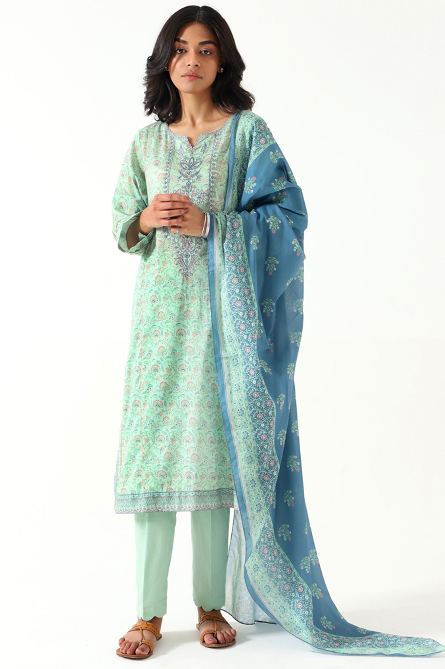 Printed Lawn Shirt with Embroidered Neckline, Printed Lawn Dupatta, Dyed Cambric Bottom, Dori & Lace for Embellishment