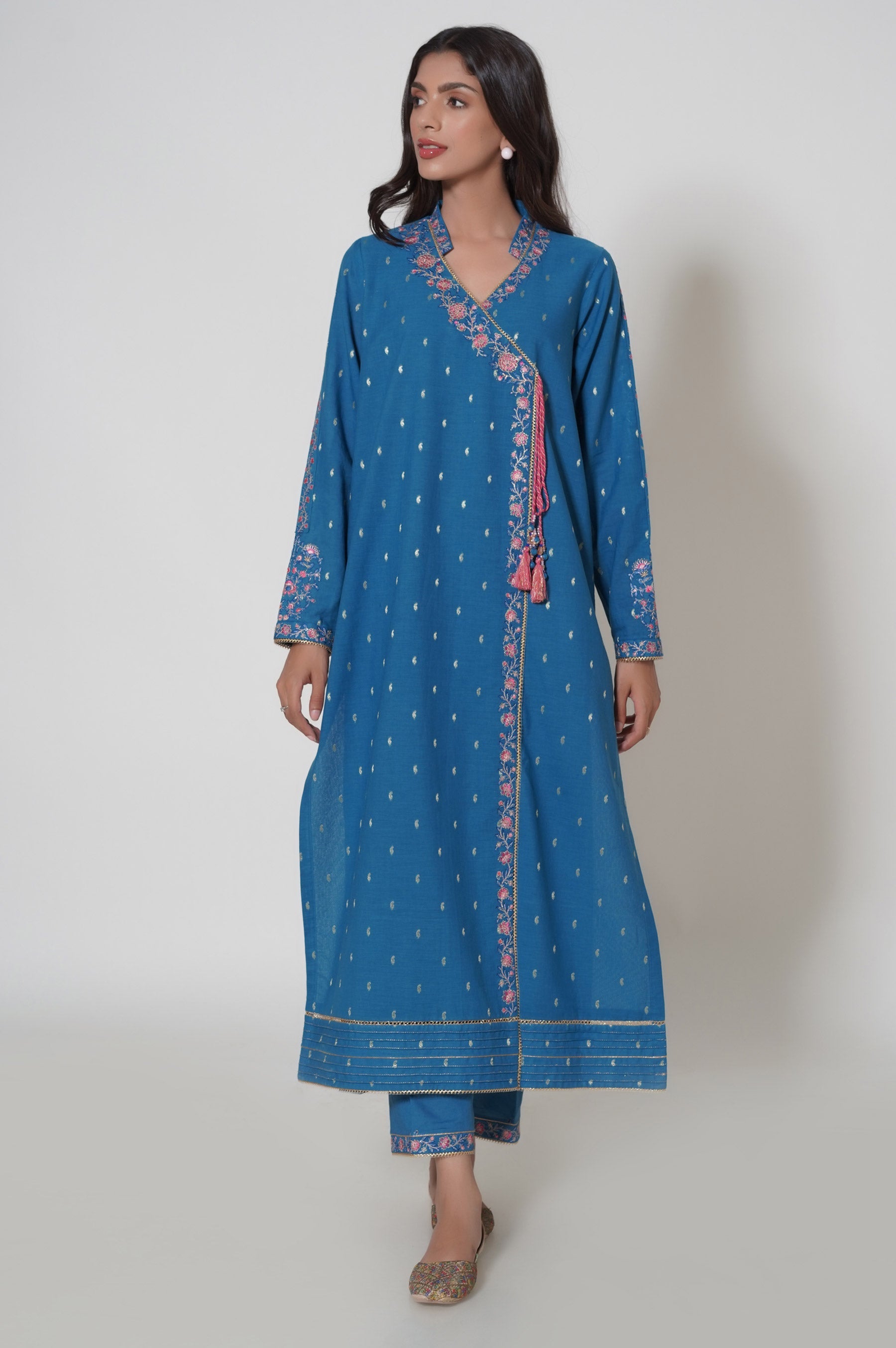 A flattering silhouette in steel blue ,elegantly embroidered with our resham thread. Paired with straight pants and resham dupatta. this ethereal look will never go out of style.