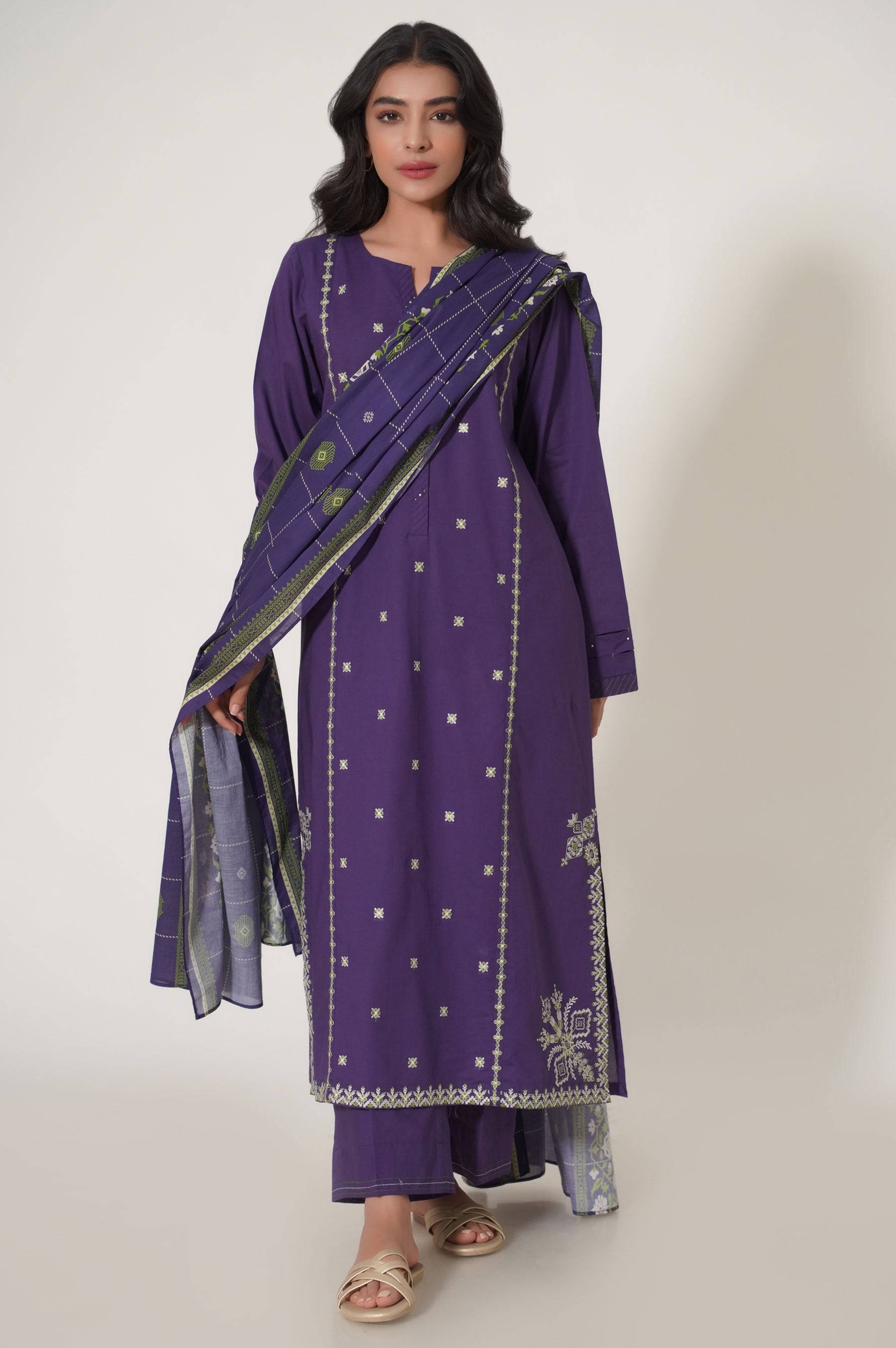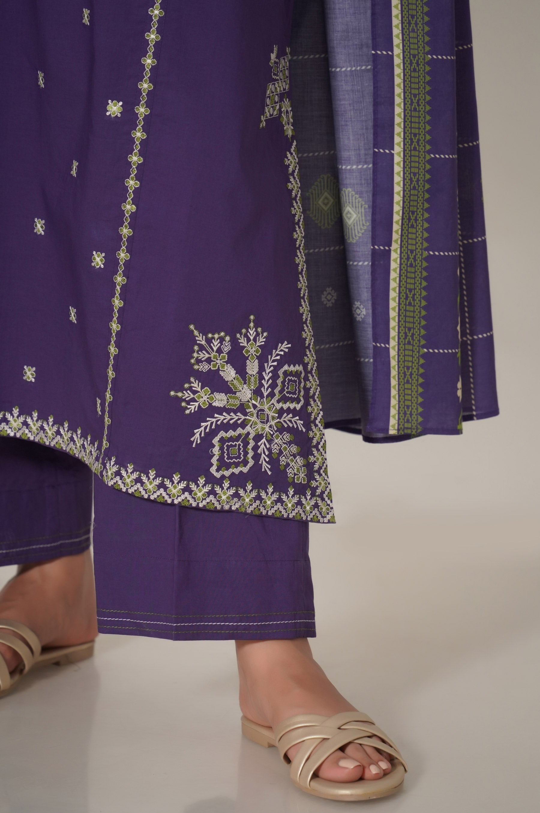 Crafted in a classic silhouette and enriched with captivating embroidery design. Look graceful in this outfit this season.