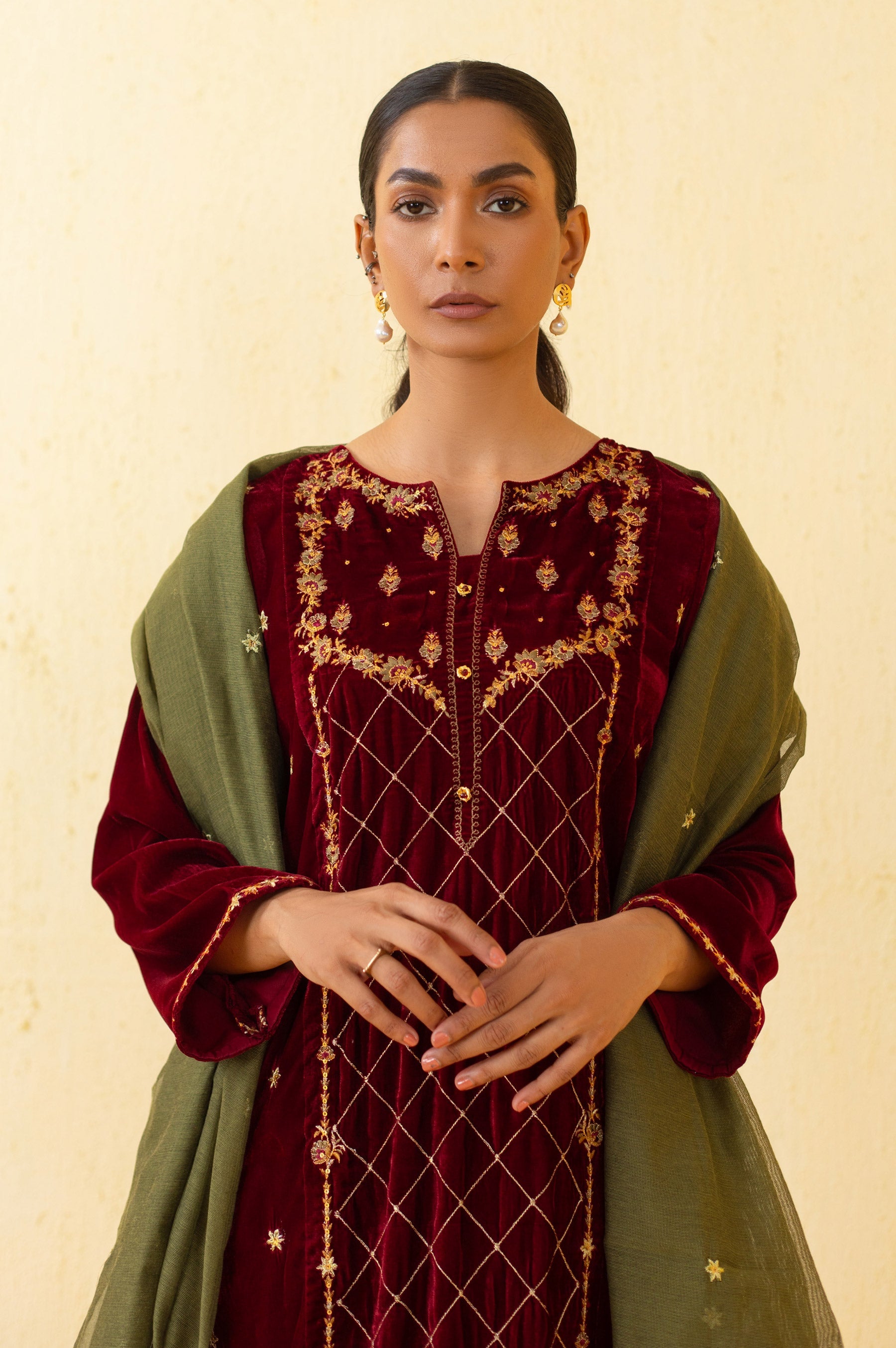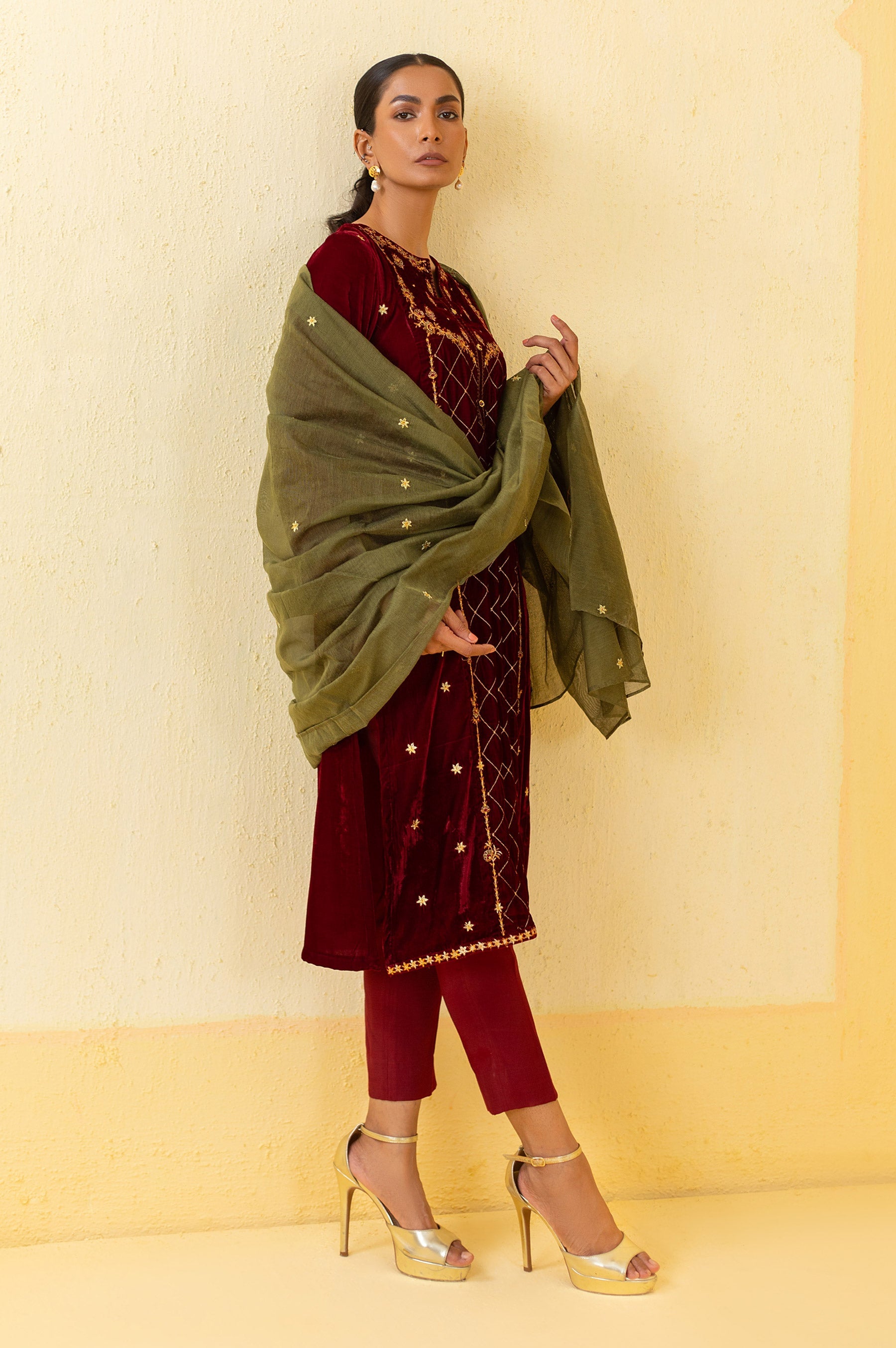 A gorgeous, maroon velvet shirt with an intricate neckline in gold zari and silk-thread work in shades of green and maroon. The gota inspired motifs touched with sequins is the highlight of this outift. Pair with matching rawsilk pants and an embroidered green khaddi net dupatta for a classy look.