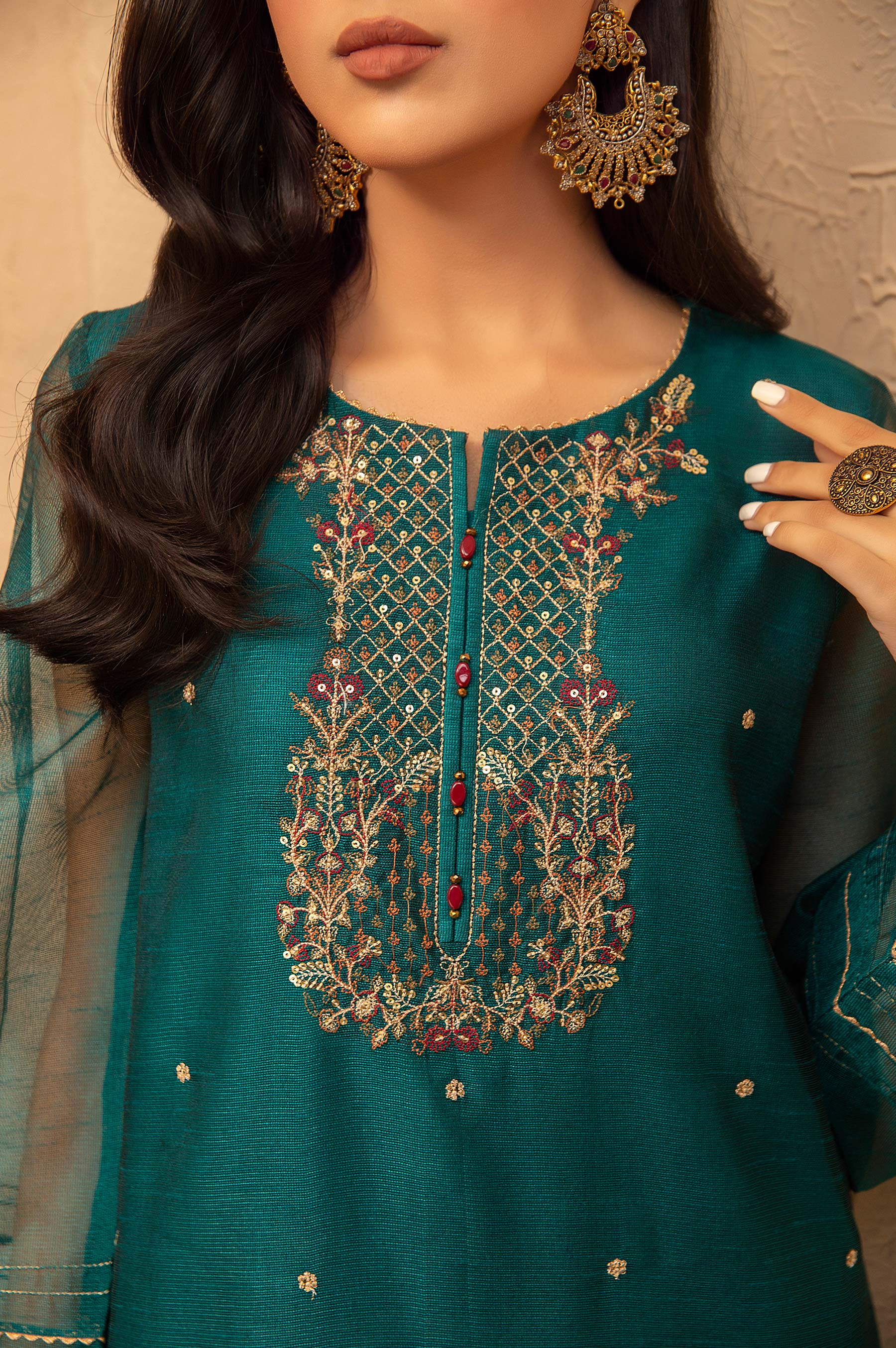 Khaddi Net Embroidered Shirt, Raw Silk Bottom, Khaddi Net DupattaFabric: Khaddi Net