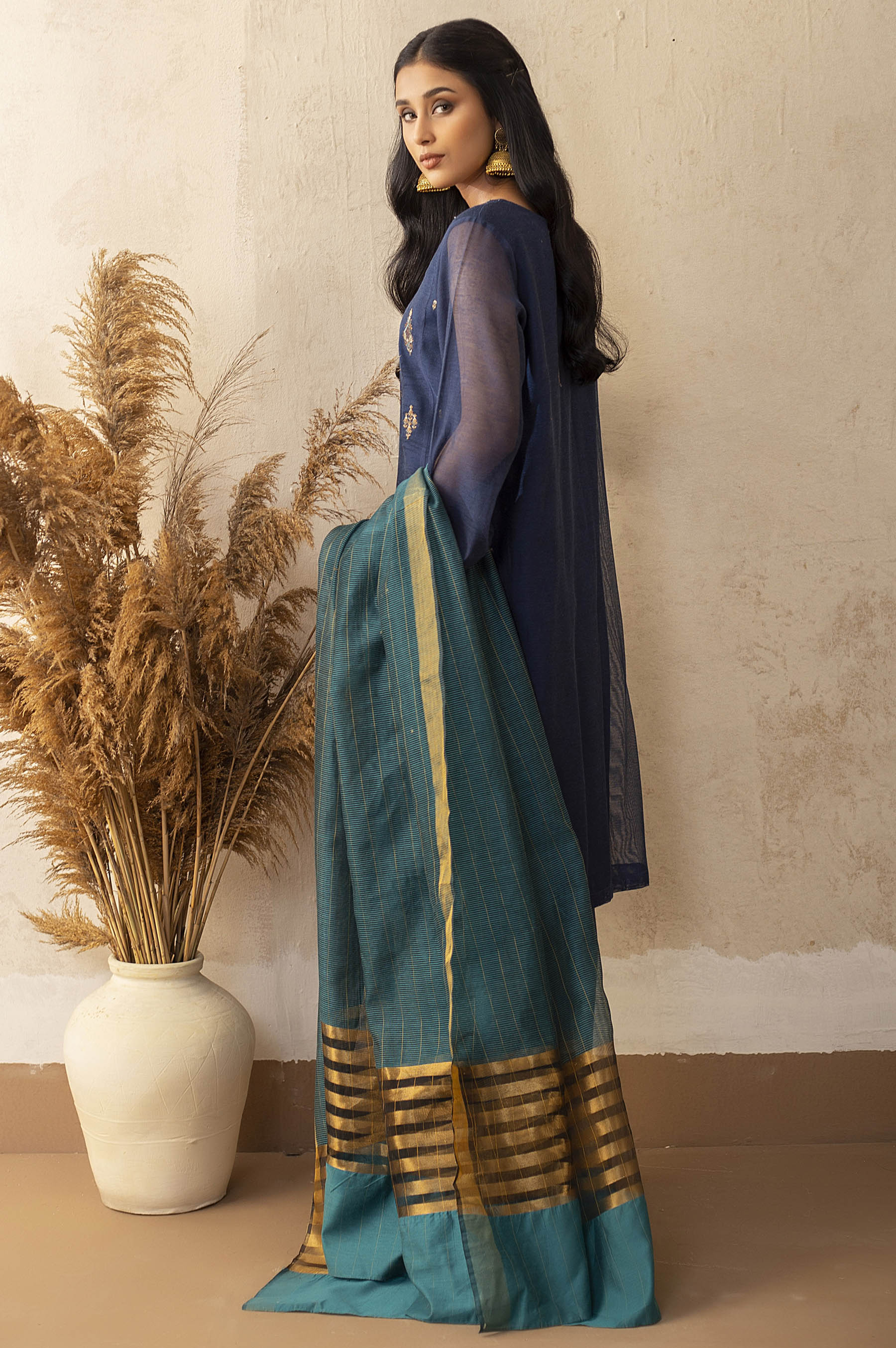Embroidered front with stylized sleeves with charma. Side slits finish with charma. Paired with stylized pants and striped yarn-dyed dupatta.