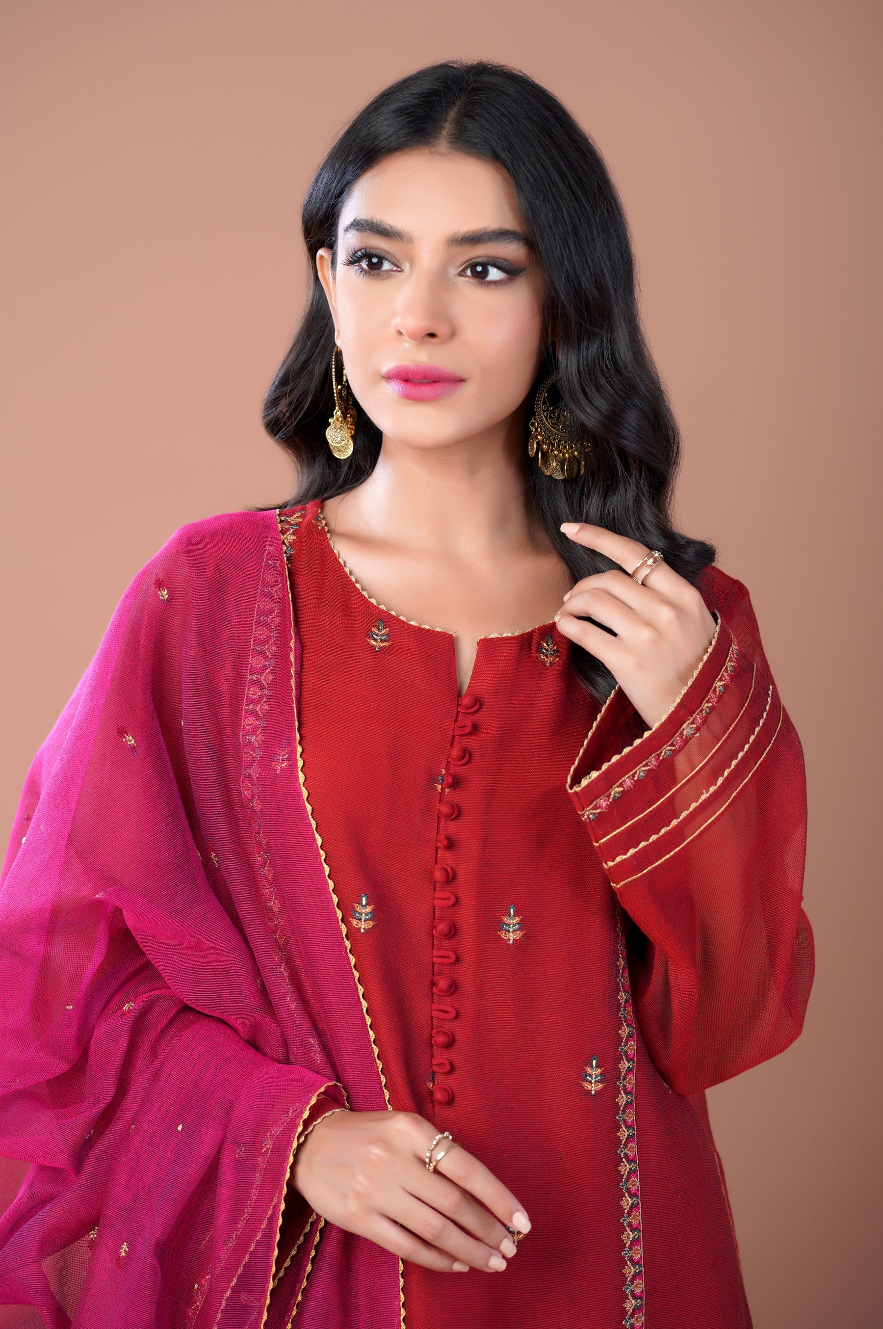 An artistically appealing composition is layered over this red ensemble, featuring a feminine khadi net shirt adorned with exquisite embroidery on front and sleeves. Paired with a contrast khadi net embroidered dupatta, this ensemble is a great option for cheerful festive events.