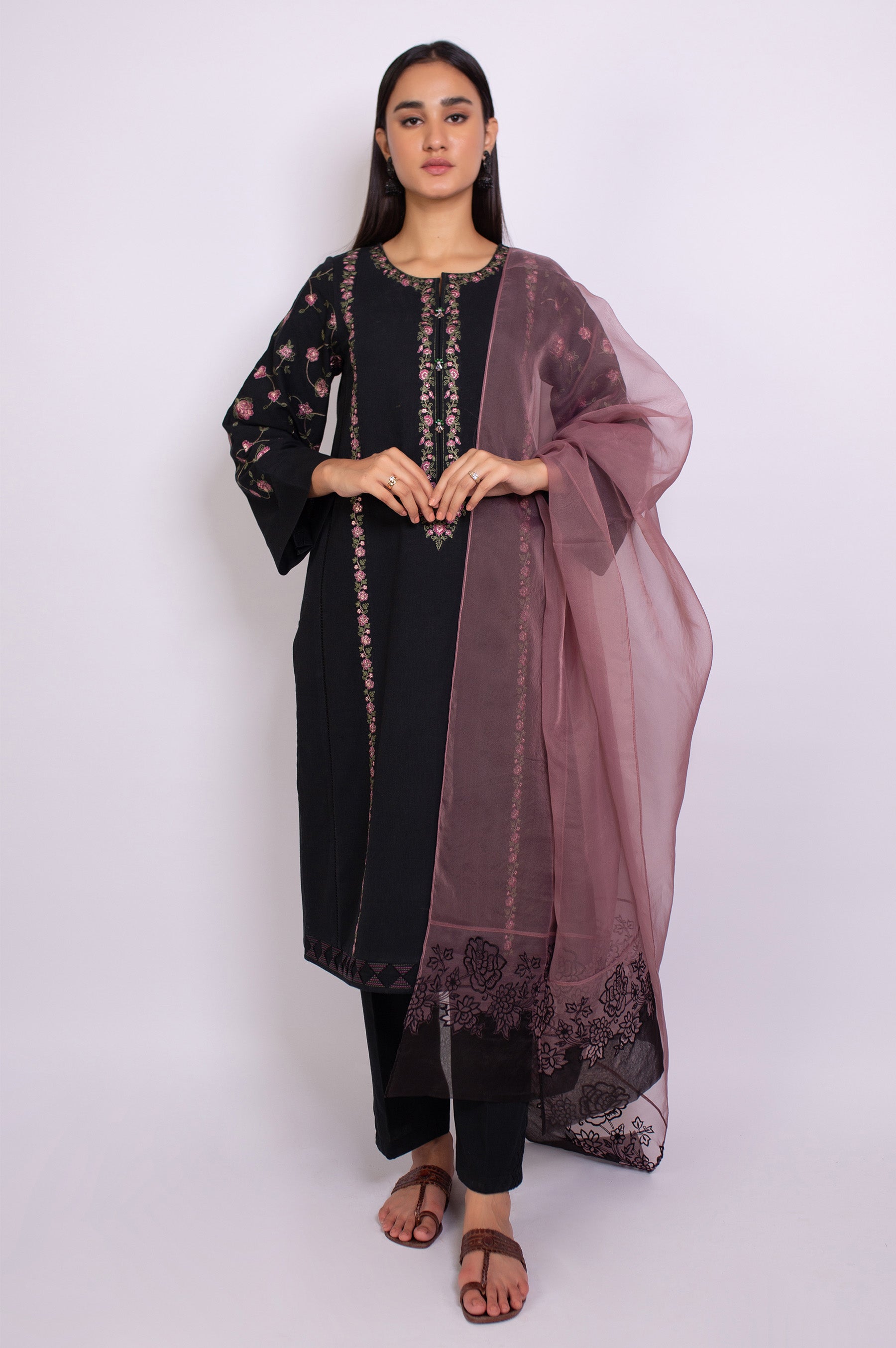 A magnificently curated masterpiece in black with traditional embroidery on the neckline, panel and sleeves. Paired with solid pants and a stunning embroidered and applique organza dupatta completes the look.